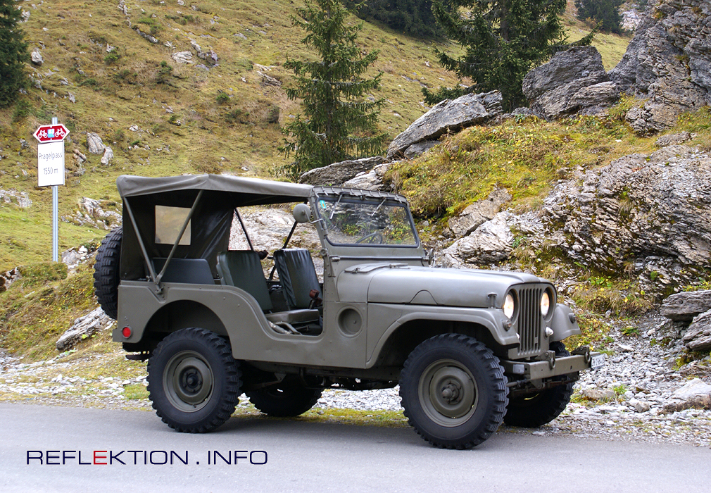 WILLYS-OVERLAND MOTORS JEEP CJ-5A Das Fahrzeug mit der Nummer M 65515 gehörte der Schweizer Armee und war mit einer 10,6 cm Pak-58-Rakete bestückt. Dazu war der JEEP auf 24 Volt umgebaut worden. Von diesem Einsatz zeugen auch die Einbuchtung an der rechten Seite und auf der gleichen Seite an der Motorhaube. Die JEEPS wurden bei der Schweizer Armee bis 1997 vollständig ausgemustert und an Versteigerungen verkauft. Heute ist das Fahrzeug in der Schweiz als Veteranenfahrzeug mit Wechselnummer zugelassen. Voraussetzungen für die Zulassung sind einwandfreie Technik und Optik, keine gewerbsmässige Verwendung und eine jährliche Fahrleistung von maximal 3000 Km. Zudem muß das Fahrzeug im Originalzustand erhalten sein. Alle 6 Jahre ist das Veteranen-Fahrzeug vorzuführen - ähnlich dem deutschen TÜV, der allerdings wegen der zu geringen Gebühreneinnahme bei einer 6-Jahres-Plakette Zeter und Mordio schreien würde. Und noch ein Zitat von Enzo Ferrari: „Der Jeep ist Amerikas einziger echter Sportwagen.“ Einige Daten: Willys-Overland Motors CJ-5A, Baujahr 1958 4-Zylinder-Reihenmotor, Hubraum 2199 ccm, Leistung 72 PS, Höchstgeschwindigkeit mühelose 90 km/h Fahrleistung 39.000 Kilometer Verbrauch: rund 20 Liter Super mit Bleiersatz-Zusatz pro 100 Kilometer