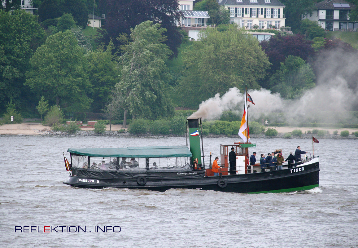 DAMPFSCHLEPPER TIGER Der Dampfschlepper von 1910 war bis 1965 im Hamburger Hafen aktiv. Seit 1978 ist er im Museumshafen Oevelgönne zu bewundern. 700 Liter Wasser und 75 Kg Kohle pro Stunde braucht die Expansionsdampfmaschine - dann leistet sie bis zu 240 PS und treibt den 17,32 Meter langen und 5,26 Meter breiten Schlepper mit bis zu 9 Knoten durch die Elbe. Sehr empfehlenswert: Am 24., 30. und 31. Oktober 2009 finden wieder die beliebten Glühweinfahrten statt. Näheres unter 0175/1632565.