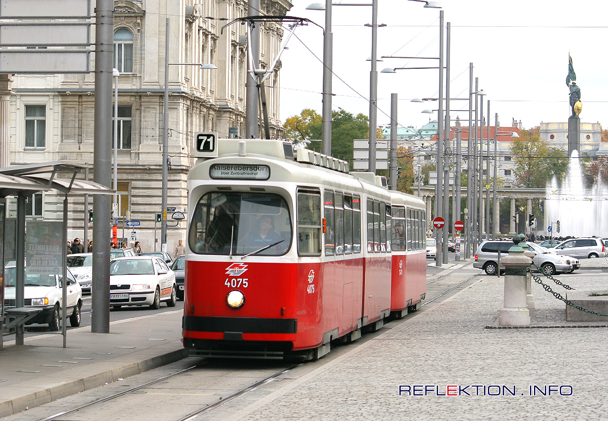 Der 71 der WIENER LINIEN Der Giaßkaunlexpress mit Triebwagen E2 4075 und Beiwagen c5 1475 Seit 100 Jahren fährt diese Straßenbahnlinie vom Schwarzenbergplatz im Zentrum Wiens zum Zentralfriedhof im Osten der Stadt. Einige Daten: E2: 4075, Indienststellung 29.10.1987, Hersteller SGP-Simmering Länge 19,1 Meter, Breite 2,3 Meter, 2x 150 kW 44 Sitzplätze, 58 Stehplätze c5 1475, Indienststellung 2.4.1987, Hersteller Bombardier, Wien 32 Sitzplätze, 46 Stehplätze Der vierachsige Ein-Richtungs-Großraumbeiwagen Typ c5 ist nur für den Betrieb hinter den Triebwagen E2 bestimmt.