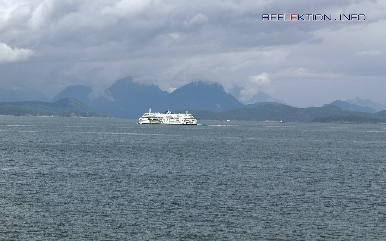 Fähre NANAIMO - HORSESHOE BAY, British Columbia, Kanada Ganz im Südwesten Kanadas, der Pazifikküste von Vancouver vorgelagert, liegt die Insel Vancouver Island. 4 Fährlinien verbinden die Orte der Insel mit dem Großraum von Vancouver in der Provinz British Columbia. Diese Fähre, die COASTAL RENAISSANCE, kommt aus Horseshoe Bay im Norden von Vancouver und fährt nach Nanaimo auf Vancouver Island. Sieben Mal pro Tag wird die 30 Meilen (rund 48 km) lange Strecke in 100 Minuten befahren. Die COASTAL RENAISSANCE ist 160 Meter lang und transportiert bis zu 370 PKW und 1.650 Passagiere. 4 MaK-Dieselmotoren treiben das Schiff mit 21.444 PS und 23 Knoten (43 km/h) voran. 2007 wurde die Fähre bei der Flensburger Schiffbau-Gesellschaft gebaut. Den Hintergrund dominieren Dreitausender der Rocky Mountains rund um das Skigebiet von Whistler.
