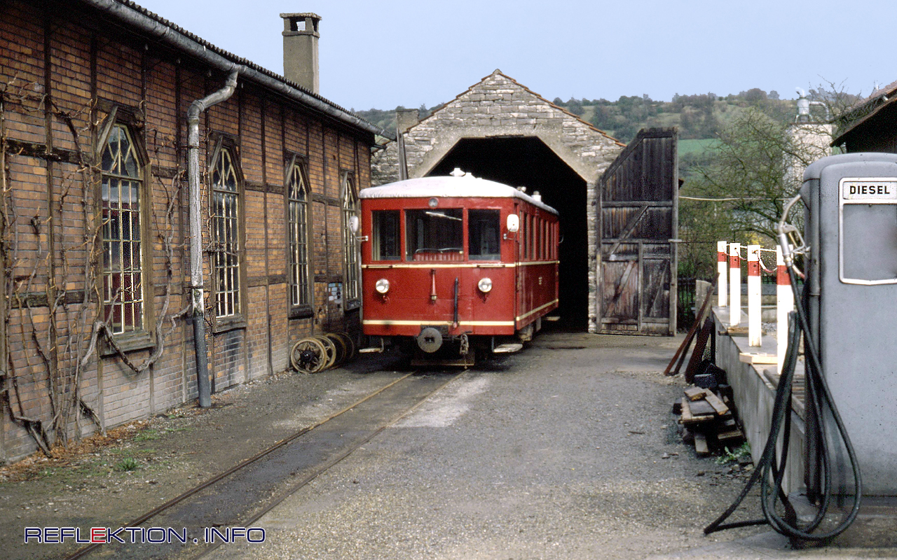 Dieseltriebwagen SWEG VT 303 -Jagsttalbahn- Im Jahre 1935 wurde der von der Waggonfabrik Dessau in einer Serie von 6 ähnlichen Fahrzeugen gebaute Dieseltriebwagen bei der Kreisbahn Osterode-Kreiensen als T 1 in Dienst gestellt. Dem Triebwagen wurde oft ein leichter Güterwagen oder bei stärkerem Verkehrsaufkommen ein Personenwagen angehängt. Im Zuge der Hauptuntersuchung im Jahre 1958 wurde die Leistung des Fahrzeugs durch Einbau eines stärkeren KHD-Motors mit 145 PS erheblich gesteigert. Angetrieben wird die jeweils innere Achse beider Drehgestelle. Nach Einstellung der KrOK im Jahre 1968 kaufte die Südwestdeutsche Eisenbahn Gesellschaft (SWEG) denTriebwagen für den Einsatz auf der 750 mm-Schmalspurstrecke von Möckmühl nach Dörzbach, der Jagsttalbahn. Im Jagsttal wurde das Fahrzeug hauptsächlich im Schülerverkehr eingesetzt. Von 1969 bis 1982 war der Triebwagen wegen Motorschaden abgestellt. 1983 erhielt der VT 303 eine Hauptuntersuchung und einen neuen Motor. Seitdem verkehrte er bis zur wegen Mängeln am Oberbau erzwungenen, vorläufigen (!) Betriebseinstellung der Jagsttalbahn in neuem Farbkleid und mit Werbebeschriftung. Nach der Betriebseinstellung hat die Südwestdeutsche Eisenbahngesellschaft (SWEG) 2002 ihre Fahrzeuge dieser Strecke an die neugegründete Jagsttalbahn AG für einen künftigen Museumsfahrbetrieb übergeben. Bis heute -seit nunmehr 33 Jahren- wartet der betriebsbereite Triebwagen im Lokschuppen von Dörzbach, vor dem er auf dem Foto bereits steht, auf die Sanierung und teilweiser Wiederinbetriebnahme der Jagsttalbahn. Ein ganz besonderes Trauerspiel mit vielen Beteiligten verschiedener Coleur in mehreren Akten über nun schon 3 Jahrzehnte und absolutem Open End.