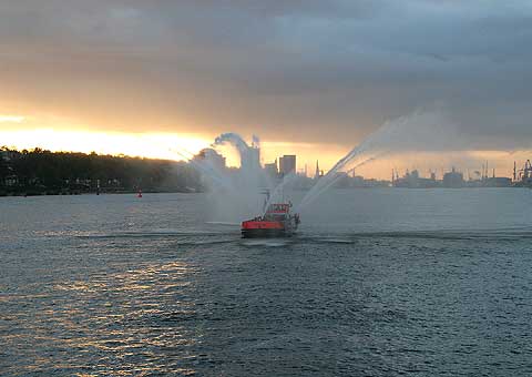 Bei Sonnenaufgang begrüßte das Feuerlöschboot OBERBAURAT SCHMIDT die AIDADIVA bei Ihrer ersten Ankunft in Hamburg. ‘Wasser marsch’ aus allen Rohren für mehr als 1 Stunde während der Einlaufbegleitung bis zum Liegeplatz am Kreuzfahrtterminal.