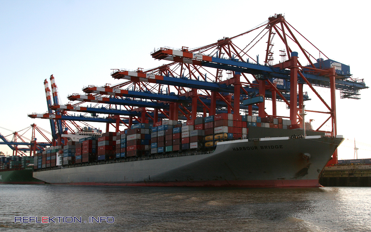 HARBOUR BRIDGE 8212 20-Fuß-Container trägt die 336 Meter lange und 46 Meter breite, 2007 gebaute HARBOUR BRIDGE. Im 70-Tage-Umlauf über Rotterdam - Hamburg - Felixstowe - Antwerp - Singapore - Hong Kong - Xiamen - Kaohsiung - Yantian - Singapore - Rotterdam komt der Containerfrachter regelmäßig nach Hamburg