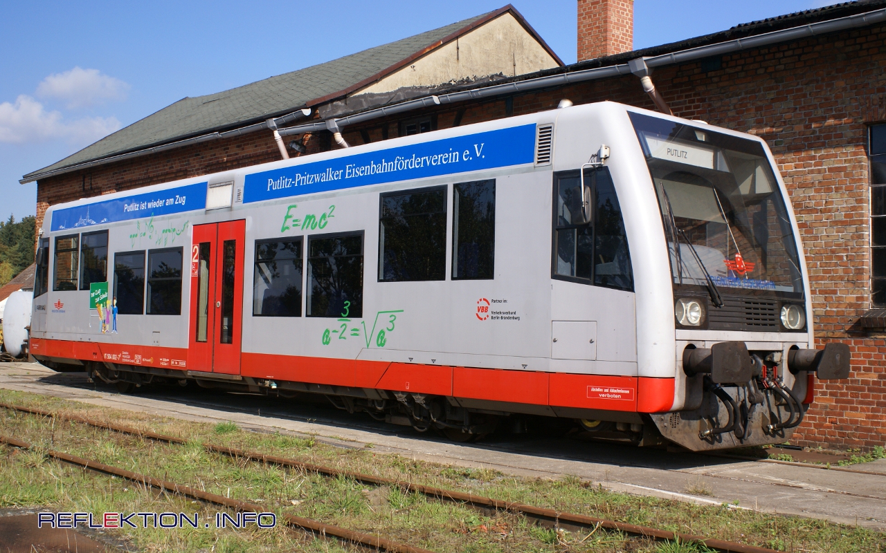 PEG VT 504 002-7 Die private Prignitzer Eisenbahn GmbH (PEG) wurde 1996 gegründet. Seit 2004 gehört die PEG zur Arriva-Gruppe, die heute als NETERINA firmiert. Die PEG betreibt Schienenpersonenverkehr in Brandenburg und Nordrhein-Westfalen. Auf der brandenburgischen Strecke Pritzwalk–Putlitz wird der Triebwagen VT 504 002-7 eingesetzt. Das Fahrzeug vom Typ LVT/S stammt von DWA (Deutsche Waggonbau AG, mittlerweile Teil von Bombardier Transportation) und wurde 1998 in Dienst gestellt. Das 23 Tonnen schwere und 16,54 Meter lange Fahrzeug bietet 56 Sitzplätze. Mit einem Dieselmotor mit 265 Kw Leistung ist der zweiachsige Triebwagen gut ausgerüstet.
