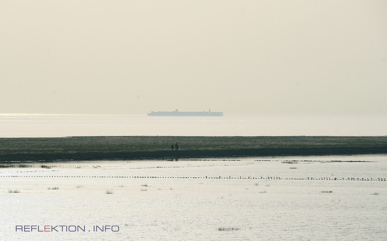 HANJIN ASIA in der Elbmündung An der Südwestküste im Schleswig-Holsteinischen Dithmarschen liegt Friedrichskoog. Bekannt ist der Ort vor allem durch die Seehundstation und den Hafen. An der Uferlinie des Wattenmeers an der Friedrichskooger Spitze -rund 3 Kilometer nordwestlich vom Friedrichskooger Hafen- läßt sich weit hinaus auf die Nordsee und auf die rund 15 Kilometer entfernte Hauptfahrrinne der Elbmündung sowie auf das rund 18 Kilometer entfernte niedersächsische Ufer bei Cuxhaven und die vorgelagerten Inseln Neuwerk und Schaarhörn (beide gehören zu Hamburg) blicken. In ungetrübten Nächten ist der über 50 Kilometer entfernte weiße Blitz des Helgoländer Seefeuers zu beobachten. Gegen 16 Uhr am wohl letzten Sommertag des Jahres 2012 passiert der 366 Meter lange und 48 Meter breite Containerfrachter HANJIN ASIA auf der Fahrt nach Hamburg die Elbmündung. Dieses Schiff gehört zur neuen Generation der großen Containerfrachter, die die Brücke vor der Schiffsmitte und den Antriebsteil im Heck tragen. Die Tragfähigkeit der 2012 gebauten HANJIN ASIA beträgt 142.500 Tonnen bzw. 13.092 20-Fuß-Container. Die Position des Schiffes am Grünpfeil auf Google-Maps