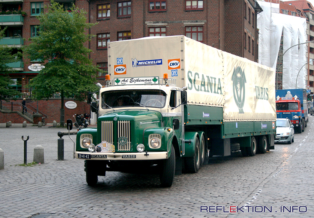 SCANIA VABIS LS 76 Zum Abschluß der Deutschlandfahrt 2008 versammelten sich rund 70 historische LKW auf dem Hamburger Fischmarkt. Mit dabei war dieser in den Niederlanden zugelassene SCANIA VABIS LS 76 mit 2-Achs-Auflieger von den DeGraaf Zevenhuizen.