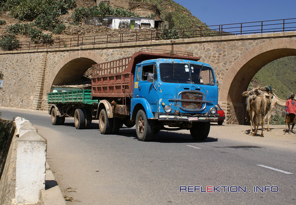 FIAT 682N3 - KÖNIG VON AFRIKA In Eritrea werden die Transporte von der Hafenstadt Massawa am Roten Meer zur Hauptstadt Asmara in rund 2300 Metern über Meer von einer großen Flotte LKW bewältigt. Dominierend ist der FIAT 682N3 in den unterschiedlichsten Varianten - mal als Dreiachser, mal als Rechtslenker. Seit der Zeit als Italien Kolonialmacht war, ist FIAT hier vorherrschend. Von 1955 an wurde der 682 gebaut. Als italienische CLASS 14to wird der 682 mit dem markanten BAFFO-Kühlergrill bald KÖNIG VON AFRIKA - REI d’AFRICA genannt - das unter der Brücke pausierende Wüstenschiff beeindruckt dies allerdings gar nicht. Bis 1966 baut FIAT den 682N3 - im Werk in Nigeria laufen erst 1989 die letzten vom Band. Der 6-Zylinder-Diesel schöpft aus 11548 ccm Hubraum 177 PS. Je nach Getriebe beträgt die Höchstgeschwindigkeit bis zu 75 km/h. Bei einem Gesamtgewicht von 34,5 Tonnen sind bis zu 15 Tonnen Nutzlast möglich - seit der Straßenzustand gut ist, sind es häufig auch einige Tonnen mehr.