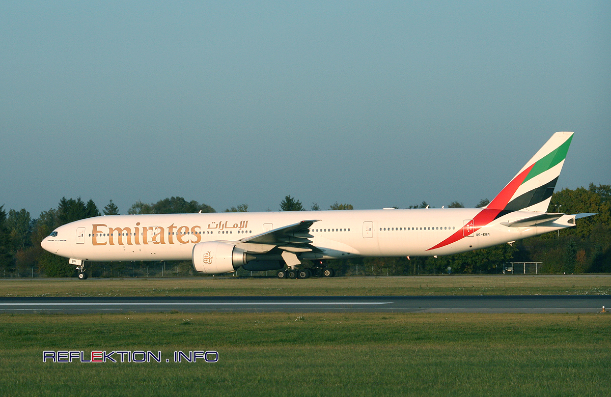 EMIRATES BOEING B 777-300ER A6-EBR Mit einer Länge von 73,90 Meter, einer Spannweite von 60,90 Meter und einer Höhe von 18,50 Meter ist die BOEING B 777-300 die größte zweistrahlige Maschine weltweit und hat auch eine Zulassung für Interkontinentalflüge. Bei EMIRATES ist die Maschine meist mit 340 Sitzen ausgerüstet. Der Zusatz ER bedeutet Extended Range (erweiterte Reichweite), d.h. 15.000 km bei einem Abfluggewicht von rund 352 Tonnen sind ohne Zwischanlandung möglich. 85 B 777 fliegen bei EMIRATES, 21 B 777-200, 12 B 777-300 und 52 B 777-300ER.