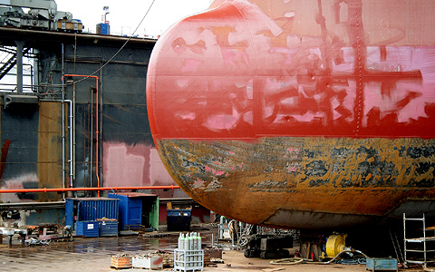 MINERVA CONCERT Der unter griechischer Flagge fahrende Öltanker MINERVA CONCERT der Reederei Minerva Marine war mit 81.600 Tonnen Rohöl auf dem Weg von Rotterdam in den dänischen Ostssehafen Fredericia. Am 14. Mai 2007 lief das Schiff auf ein Felsenriff vor der Insel Samsö. Bei der Havarie wurde das Unterwasserschiff schwer in Mitleidenschaft gezogen. Auf einer Länge von mehr als 12 Metern wurde der Rumpf im Bugbereich aufgerissen und auf mehr als 40 Metern stark beschädigt. Den Reparaturauftrag erhielt die Hamburger Werft BLOHM + VOSS. Bevor das Schiff ins Dock verholt werden konnte, mußten hier die Tanks gereinigt werden. Anschließend wurde die MINERVA CONCERT mit Schlepperhilfe in Europas größtes Schwimmdock, Blohm + Voss Dock 11, manövriert. Das Dock ist 274 Meter lang, und 54 Meter breit. Die 241 Meter lange und 42 Meter Breite MINERVA CONCERT hat hier nach allen Seiten noch gut Luft. An der Unterseite der Bugwulst sind die eingeschweißten neuen Außenhaut-Bleche gut zu erkennen. Im Vergleich zum Dockarbeiter werden die gewaltigen Abmessungen deutlich.