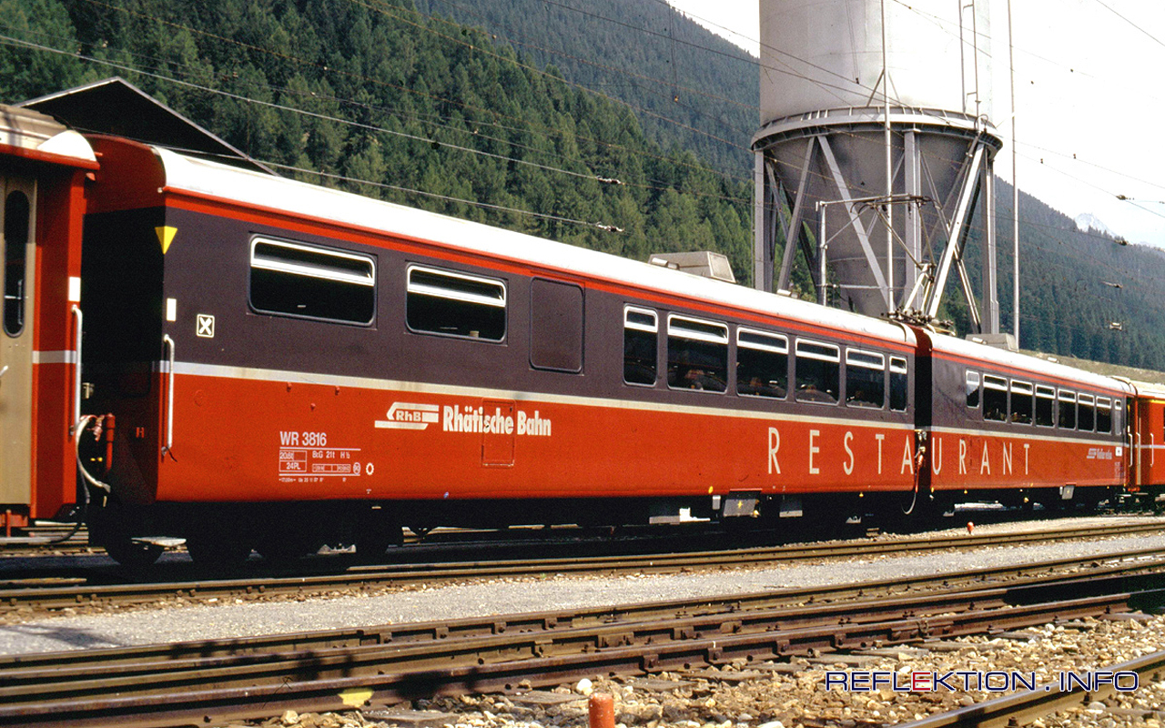 1987 hat die RHÄTISCHE BAHN einen Doppelspeisewagen mit insgesamt 60 Plätzen und einem Küchentrakt erhalten. Dafür konnten die  beiden alten Speisewagen WR 3813 und 3814 aus den Dreißiger Jahren abgestellt werden. Die gemeinsam von der RHÄTISCHEN BAHN und den Flug- und Fahrzeugwerken Altenrhein (FFA) gebauten Wagen gelten mit einer Gesamtlänge von 34 Metern als längster Speisewagen Europas.