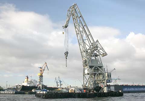 Schwimmkran HHLA IV Der Schwimmkran HHLA IV mit einer Hubkraft von 200 Tonnen wird in diesem Jahr 50 Jahre alt. Ein weiterer Schwimmkran, der HHLA III mit einer Hubkraft von 100 Tonnen, wurde bereits 1941 geliefert. Er sollte eigentlich im Rahmen des Hitler-Stalin-Paktes an die UdSSR geliefert werden, verblieb dann aber nach dem Angriff auf die Sowjetunion in Hamburg. Beide Kräne wurden von der DEMAG gebaut. Sie werden trotz ihres Alters nach wie vor häufig eingesetzt, hauptsächlich zur Verladung schwerster Stückgüter wie Maschinenteile oder Lokomotiven. Auf dem heutigen Bild des Tages wird eine neue Schiffsschraube zum Dock 11 von Blohm + Voss gebracht. Die Schraube war per Schwertransport auf der Straße vom Herstellerwerk an der Müritz zum Kai an der Australiastraße, dem Liegeplatz der Schwimmkräne, gebracht worden. Die Schwimmkräne treten in Aktion, wenn die Verladung der Objekte aufgrund ihrer Größe und ihres Gewichtes nicht per Containerbrücken oder anderen landseitigen Möglichkeiten durchgeführt werden kann. Durch einen eigenen Gleisanschluß ist die Übernahme von Großkolli direkt von der Bahn und der anschließende Weitertransport möglich. Mit den HHLA-Schwimmkränen lassen sich Projekt- und Schwergutverladungen bis 300 t bewerkstelligen. Und dies nicht nur im Hamburger Hafen, sondern auch auf der gesamten Unterelbe bis Brunsbüttel.