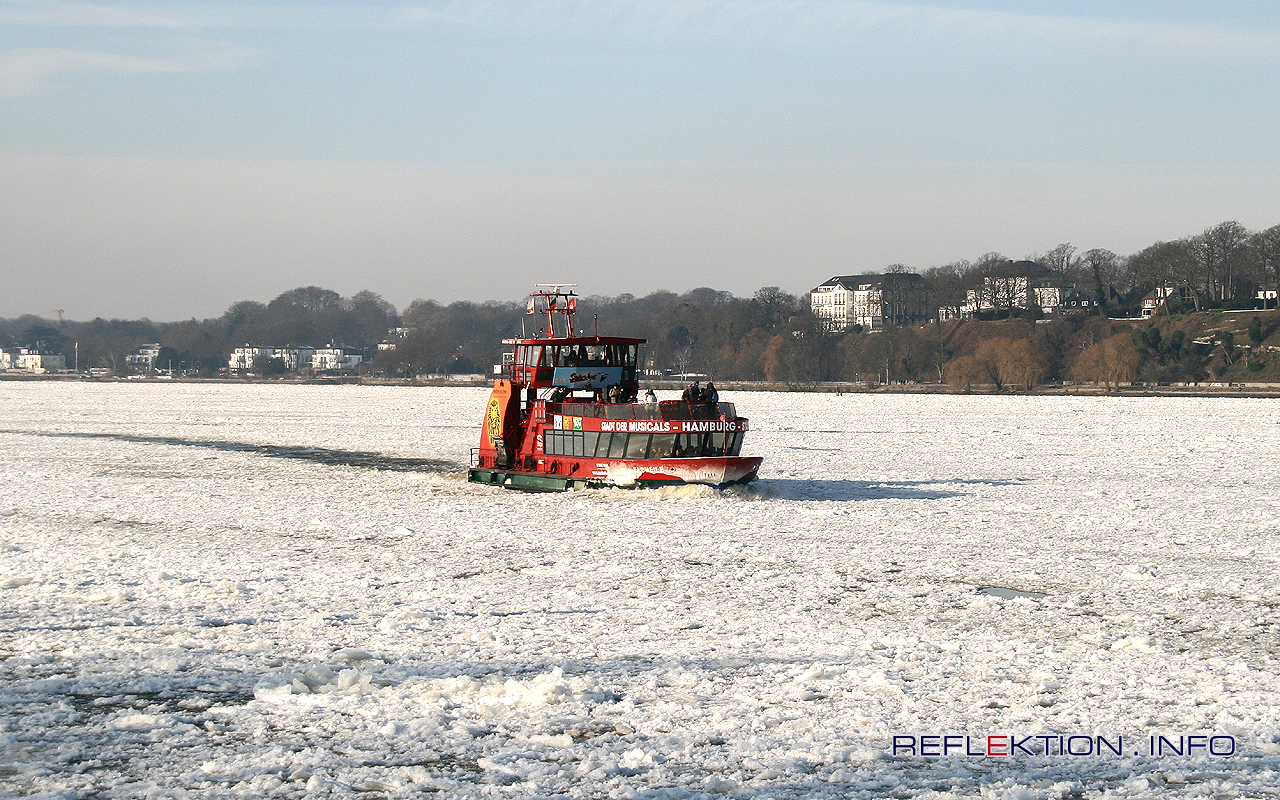 Winter im Hafen Mühelos durchfährt die HADAG-Fähre ELBMEILE vor der Silhouette der Elbchaussee das Eis der Elbe im Hamburger Hafen - im letzten Winter. Im jenem letzten Winter gab es im Hamburger Hafen viel mehr und viel länger Eisgang als in diesem Winter. Und eben auch Sonne und Licht. In diesem Jahr reichen für das Zählen sonniger Tage gerade einmal 2 Finger einer Hand - seit dem Neujahrstag herrscht fast durchgehend eine graue Suppe als Himmel und ein nahezu täglich wiederkehrendes Gemisch aus Regen und Schnee. Grausam, man sehnt den Frühling herbei!