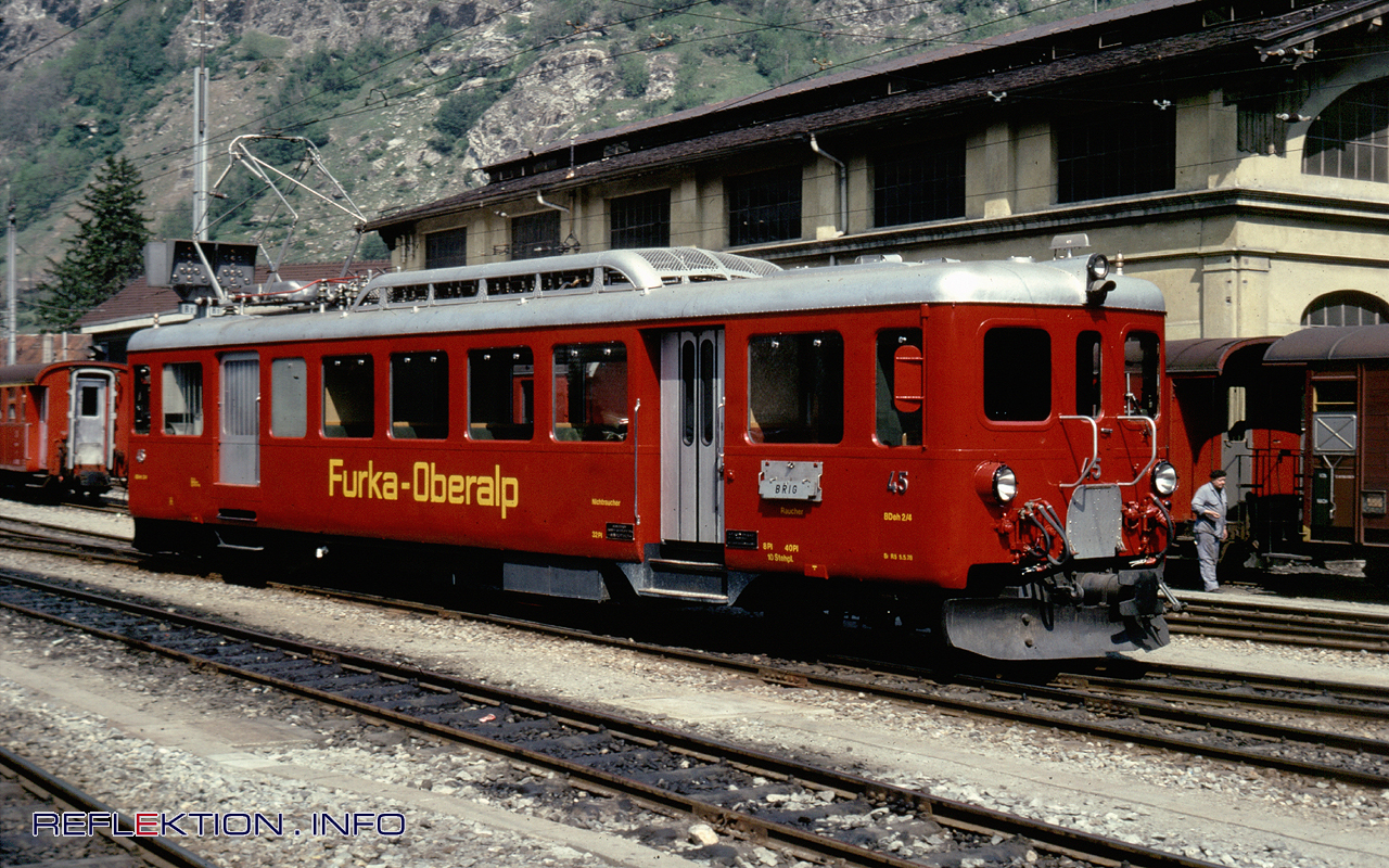 Seit 1941 bildeten die 5 Altbautriebwagen mit Zahnradantrieb der Reihe BDeh 2/4 41 - 45 das Rückgrat der Personenbeförderung bei der Furka Oberalp-Bahn von Brig im Wallis über Andermatt nach Disentis in Graubünden. Mittlerweile ist die Furka Oberalp-Bahn in der Matterhorn-Gotthard-Bahn aufgegangen und der letzte verbliebene dieser Triebwagen, die Nr. 41 von 1941, ist an die Dampfbahn Furka-Bergstrecke (DFB) übergeben worden.