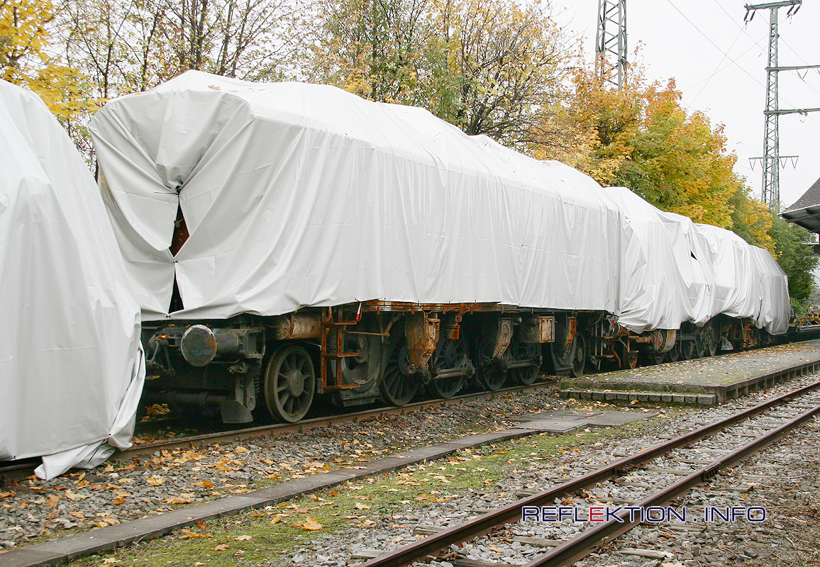 BRANDOPFER E 75 09 und 50 622 Vor fast genau 4 Jahren, am 17.10.2005 ist im DB-Bahnbetriebswerk Nürnberg West im Stadtteil Gostenhof der Ringlokschuppen nach Dachdeckerarbeiten komplett abgebrannt. Verbrannt sind alle 24 im Schuppen abgestellten historischen Fahrzeuge des der Öffentlichkeit nicht zugänglichen gewesenen Gebäudes. Im Freigelände des DB Museum Nürnberg sind noch immer 4 Brandopfer abgestellt, mit deren Wiederherstellung noch nicht begonnen wurde. Vor kurzem ist es der DEUTSCHEN BAHN aber gelungen, die historisch wertvollen Fahrzeuge mit neu angeschafften Planen abzudecken, so unter anderen die Elok E 75 09 und die Dampflok 50 622. Für weitere Arbeiten an den Fahrzeugen ist zur Zeit kein Geld da, sagt der Global Player DB. Die Aussage ist nachvollziehbar, verschlingt doch die Bespitzelung der eigenen Mitarbeiter nach DDR-Stasi-Art viel Geld, das hier oder an anderer Stelle halt fehlt.