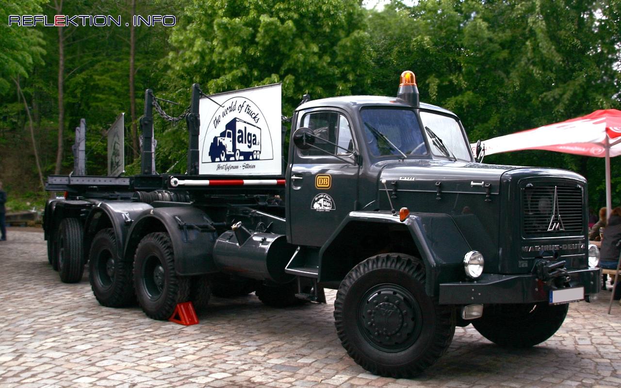 MAGIRUS-DEUTZ 230 D 22 AK , 1971 Als älteste Motorenfabrik der Welt gilt die 1864 von Nikolaus August Otto und Eugen Langen gegründete „N.A. Otto & Cie“. Seit 1872 unter „Gasmotoren-Fabrik DEUTZ AG“ firmierend lautet der heutige Name „DEUTZ AG“. Wurden zunächst noch Weiterentwicklungen des von dem Jean Joseph Ètienne Lenoir erfundenen Gasmotors hergestellt, vollendete Otto 1876 die erste Maschine nach dem von ihm erfundenen Viertaktprinzip. Der Ottomotor begann seinen bis heute andauernden Siegeszug. Wärmekraftmaschinen nach den Prinzipen Rudolf Diesels entstanden hier ebenfalls bereits 1898, allerdings nach eigener Konstruktion. Ein Lizenzvertrag zwischen der GFD und der Maschinenfabrik Augsburg, an die Diesel seine Patente verkaufte, bestand zwischen 1897 und 1901. Nachdem dieses Patent 1907 auslief, begann die Dieselmotorenfertigung im Hause Deutz in großem Stile. Mit der Übernahme der „Fahrzeugfabrik C.D.Magirus AG“ in Ulm im Jahre 1936 stand nun auch eine Lastwagenfertigung unter dem eigenen Dach zur Verfügung, in die die eigenen Motoren eingebaut werden konnten. Im Kriegsjahr 1944 gelang es, den ersten luftgekühlten Dieselmotor zur Serienreife zu bringen, der Grundstein für den Markenerfolg in der Zukunft war gesetzt. Luft gefriert nicht, Luft kocht nicht, diese Aussage der Volkswagenfahrer galt von nun an auch für die LKW aus dem Hause „Klöckner-Humboldt-DEUTZ AG“, wie das Unternehmen seit 1936 heißt. Das Ulmer Münster als Emblem auf den Fahrzeugfronten, wurde die Lastwagen als „Magirus-Deutz“ erfolgreich vermarktet. Der hier vorgestellte Magirus-Deutz 230 D 22 AK 6x6 vom Baujahr 1971 steht doppelt am Ende einer Fahrzeuggeneration, die ihre Wurzeln in den letzten Kriegsjahren hat. Wurde die eckige Haubenbauweise dieser Zeit in den 1950er Jahren durch die markante Rundhaube abgelöst, gelang dies nicht bei Fahrzeugen für den Geländeeinsatz. Die Verwindungen des Fahrzeugrahmens konnten von der aus einem Blech gepressten Haube nicht ausgeglichen werden und so wurde eine im alten Stil gehaltene mehrteilige Haube zum Charakteristikum. Erst 1970 erschien eine völlig neue Kabinengestaltung für die Haubenwagen, die alte Ausführung wurde noch für eine kurze Zeit weitergebaut. Das angedeutete „doppelt am Ende“ meint aber auch die Fahrzeuggröße. Dieser Typ stand am oberen Ende des Fahrzeugangebotes. Eingebaut ist ein 230 PS leistender und natürlich luftgekühlter V8-Zylindermotor, der seine „Bullenkraft“ aus fast 13 Litern Hubraum schöpfte. Zur Fortbewegung der maximal 22 Tonnen Gesamtgewicht auf der öffentlichen Straße wurden alle drei Achsen angetrieben. Auch wenn das „AK“ in der Typenbezeichnung auf einen „Allrad-Kipper“ schließen mag, wir befinden uns hier im Segment der Spezialfahrzeuge. Als „Kipper“ mag das Fahrgestell werkseitig vorgesehen sein, aber ein besonderer Aufbau konnte selbstverständlich auch montiert werden. Mit einem ebenso speziellen Anhänger versehen, diente dieses Gespann der Deutschen Bundesbahn, die mit ihm Weichenteile an Gleisbaustellen verbrachte. Die Deutsche Bundesbahn unterhielt nahezu unbemerkt von der Öffentlichkeit auch einen großen Park spezieller Fahrzeuge für die unterschiedlichsten Einsatzzwecke. Vom „Kohlenkuli“ zur Versorgung kleiner Dienststellen mit Lokomotivkohle über Zugmaschinen zur Beförderung von Güterwagen auf speziellen Straßenrollern bis hin zu Unimogs für abseits der Straßen gelegene Aufgaben gab es eine respektable Vielfalt. Nochmals kurz zu Magirus-Deutz. 1969 überraschte das Unternehmen mit einer so noch nicht gekannten Werbeoffensive. Die Lastwagen des Hauses bekamen einen markanten Namen: Die deutschen Bullen waren geboren. Die Robustheit und Langlebigkeit der Fahrzeuge wurde in einem einprägsamen Slogan verpackt. Wie war doch manchmal in Fuhrunternehmer-Kreisen zu hören? Einen Magirus-Kipper brauchte man immer dann, wenn ein steckengebliebener Mercedes aus dem Matsch gezogen werden musste und kein Henschel verfügbar war. Zu besichtigen sind dieses Fahrzeug und viele weitere LKW im empfehlenswerten ALGA-Museum im niedersächsischen Sittensen direkt an der A1. (www.alga.de)