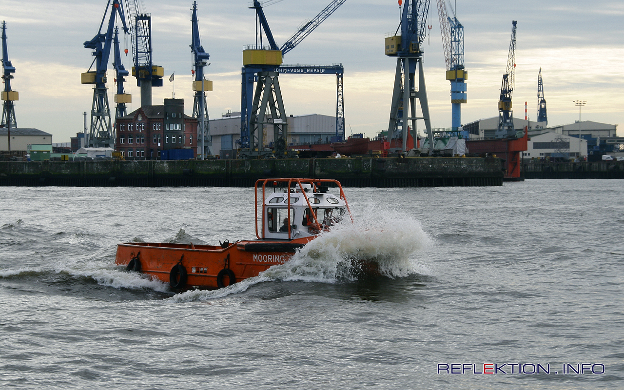 Festmacherboot - oder wie es in Hamburg jetzt auf neudeutsch heißt ‘Mooring Tug’. In der gleichen Art und Weise wurde aus der Hamburger Hafenbehörde die Hamburg Port Authority oder aus dem Lotsen ein Pilot.