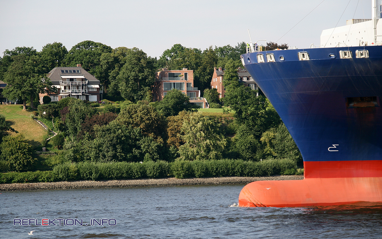 CMA CGM CALLISTO Mit der CMA CGM CALLISTO machte am Nachmittag des 6. August der erste Containerriese im neuen FAL5-Dienst im Hamburger Hafen fest. Der gemeinsam von CMA CGM und Maersk Line betriebene Fernostdienst FAL 5 verbindet Hamburg mit Port Kelang, Singapur, Ningbo, Shanghai, Shenzhen-Yantian und Tanjung Pelepas, Le Havre, Rotterdam und Zeebrügge. Der Neubau CMA CGM CALLISTO wurde im Juli von Hyundai Heavy Industries Ulsan an CMA CGM geliefert. Er ist 363 Meter lang, 45,6 Meter breit, verfügt über eine Stellplatzkapazität von 11.356 TEU (20 Fuß-Standardcontainer) und bietet 800 Anschlüsse für Kühlcontainer (Reefer). Bei maximaler Auslastung erreicht das Containerschiff einen Tiefgang von 15,5 Metern. Den Hamburger Hafen lief die CALLISTO mit 6.677 TEU an Bord nur teilbeladen an. Am HHLA-Containerterminal Burchardkai wurden insgesamt 3.521 TEU gelöscht und 2.421 TEU geladen. Am 7. August lief die CALLISTO wieder aus und passiert zum Zeitpunkt der Aufnahme Hamburgs an der Elbe gelegene Perlenkette, die Elbchaussee. Immer mehr Großcontainerschiffe laufen den Hamburger Hafen an. Im Jahr 2010 werden mehr als 100 Ankünfte von Schiffen über 10.000 TEU erwartet. Der Containerverkehr mit Asien erreichte 2009 in Hamburg ein Gesamtvolumen von 4,2 Millionen Containern (TEU). Mit 2,3 Millionen TEU nahm die Volksrepublik China (inklusive Hongkong) auch 2009 die Spitzenposition unter den wichtigsten Handelspartnern des Hamburger Hafens im Containerverkehr ein, gefolgt von Singapur. Weitere Top-Handelspartner in Asien sind Südkorea, Malaysia und Japan.