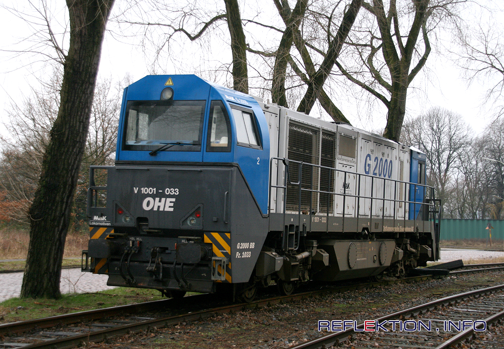 OSTHANNOVERSCHE EISENBAHNEN - Diesellok VOSSLOH G2000 1001-033 Vossloh Schienenfahrzeugtechnik GmbH (VSFT) lieferte die G 2000 BB am 31.12.2001 an LC-Locomotion Capital (seit 2003 Angel Trains Cargo), London aus. Von dort wird die Lok vermietet. 10 Stationen quer durch Deutschland hatte die 1001-033 hinter sich, als sie im April 2007 zu den Osthannoverschen Eisenbahnen AG (OHE) in Celle kam. Die Maschine mit den gewöhnungsbedürftigen asymmetrischen Führerständen wird von den OHE auch im Containerverkehr im Hamburger Hafen eingesetzt. Der Catarpillar-Dieselmotor leistet 2240 kw. Die 17,4 Meter lange, vierachsige Lok hat ein Dienstgewicht von 87,3 Tonnen. Die Höchstgeschwindigkeit liegt bei 120 km/h. 20 Maschinen dieses Typs hat Vossloh bis 2003 gebaut. Weitere 48 Loks wurden bisher mit symmetrischen Führerhäusern hergestellt.