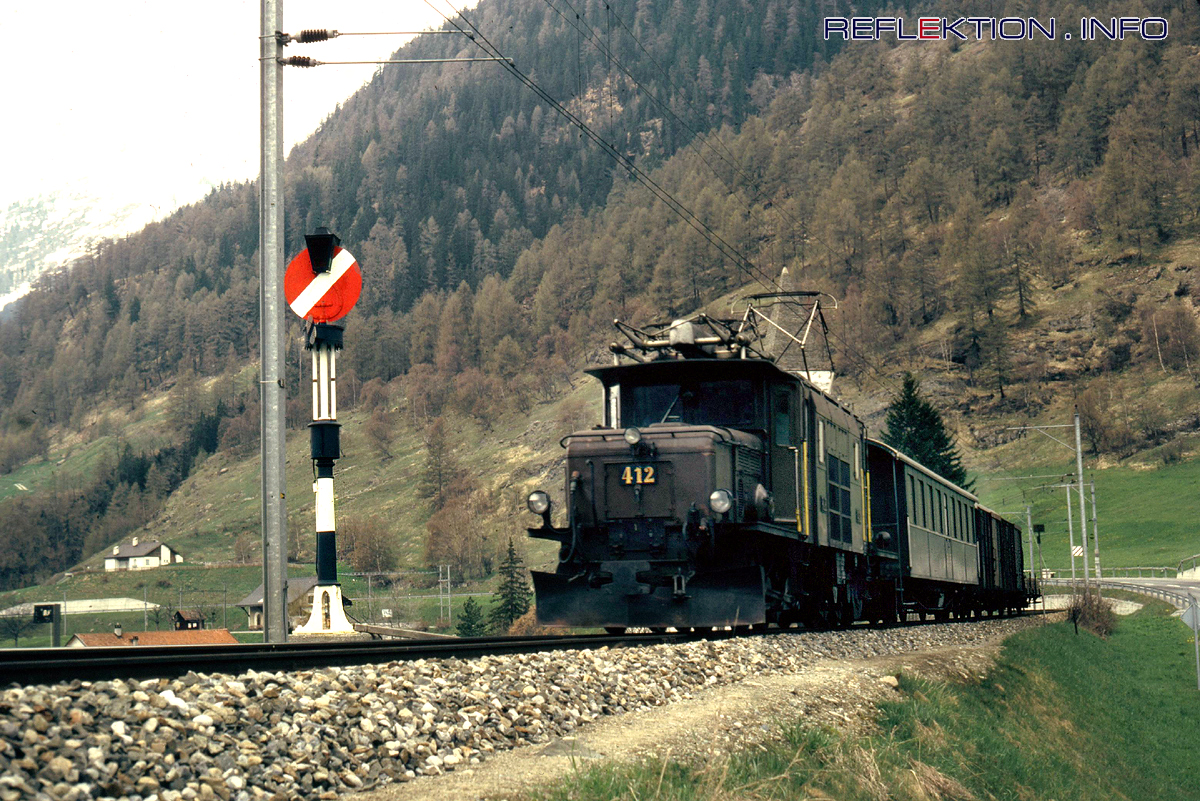 RHÄTISCHE BAHN - LUMPENSAMMLER 1979 Ende der Siebziger Jahre, als die Rhätische Bahn noch braun und grün war, galt es für Eisenbahnliebhaber als das größte Vergnügen mit einem Lumpensammler, also einem GmP, einem Güterzug mit Personenbeförderung die Strecken abzufahren. Der Zug hielt an jedem Bahnhof und Güter wurden be- und entladen. Wenn ein Güterwagen abgehängt oder angehängt werden sollte, übernahm die Zuglok -in diesem Fall das Krokodil Ge 6/6 412- die Rangieraufgaben. Es gab viel zu beobachten und man wußte vorher nie genau, wann das Ziel erreicht wurde. Das war auch nicht wichtig - denn der Weg war das Ziel. Dieser GmP mit der Ge 6/6 412, die in späteren Jahren durch den umstrittenen blauen Anstrich heftige Reaktionen hervorrief, zieht ihren GmP, bestehend aus dem vierachsigen Personenwagen mit offenen Bühnen Bi 2274, 2 geschlossenen Güteragen Gbk und einem Niederbordwagen Kk-w, von St. Moritz kommend durch das Unterengadin nach Scuols/Tarasp. Bei Lavin passiert der Zug eine Hipp’sche Wendescheibe, ein auch 1979 schon seltenes Streckensignal. Heute sind sowohl die Hipp’sche Wendescheibe hier verschwunden als auch das Krokodil 412. Von letzterem sind aber viele Teile erhalten geblieben, sie dienen als Ersatzteile für die beiden im historischen Betrieb stehenden RhB-Krokodile 414 und 415. Die Position des Zuges auf Google-Maps