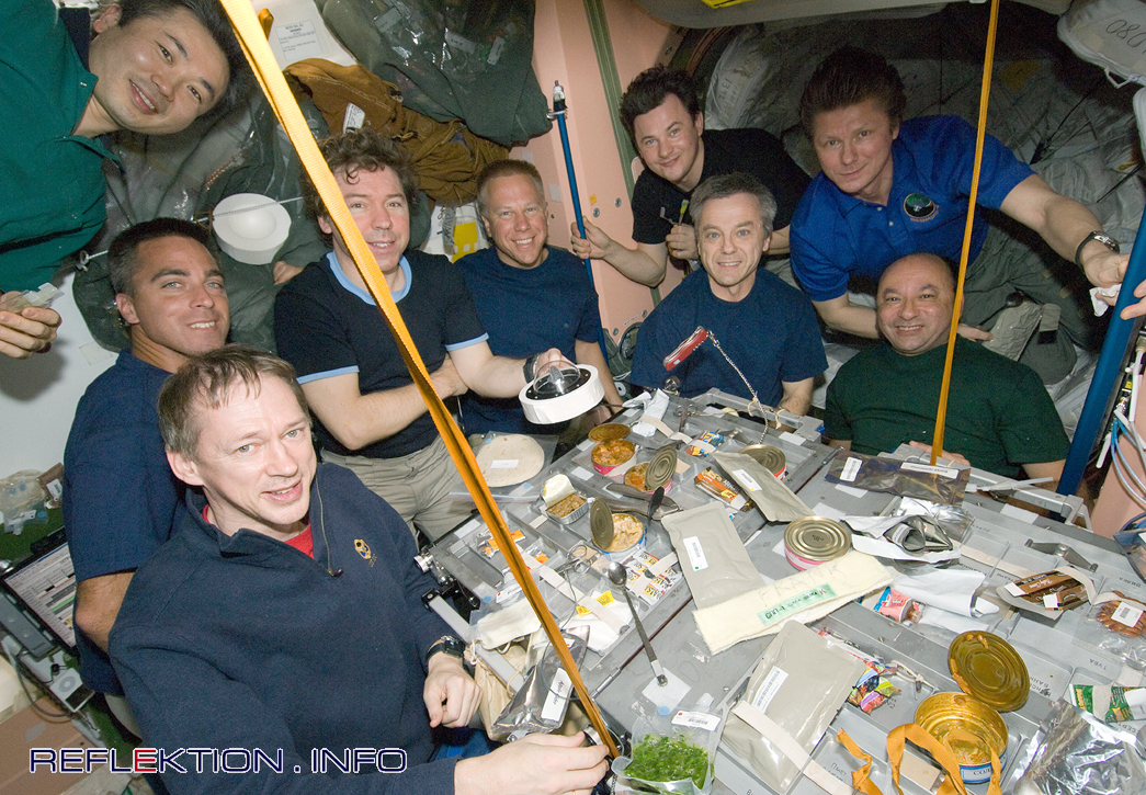 Lunch in der INTERNATIONALEN RAUMSTATION ISS 9 von derzeit 13 Astronauten und Kosmonauten an Bord der Internationalen Raumstation ISS sitzen am 21.7.2009 zusammen beim Lunch. An dem Spezialtisch, der Teller und Speisen mit Spezialklettstreifen an ihren Plätzen hält, sitzen von links nach rechts ESA-Astronaut Frank DeWinne, die US-Astronauten Christopher Cassidy, Mike Barratt und Tim Kopra, der Kanadier Robert Thirsk und der US-Astronaut Mark Polansky. Darüber der Japaner Koichi Wakata und die russischen Kosmonauten Roman Romanenko und Gennady Padalka. Nicht auf dem Bild sind Tom Marshburn, Dave Wolf, Doug Hurley und die Kanadierin Julie Payette. Soviele Personen haben sich bisher noch nie auf der ISS aufgehalten, 7 von ihnen sind mit dem Space Shuttle ENDEAVOUR zu Gast.