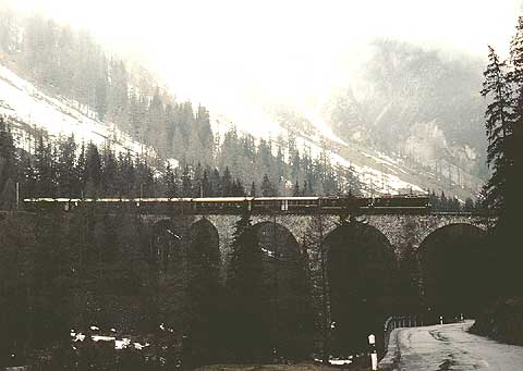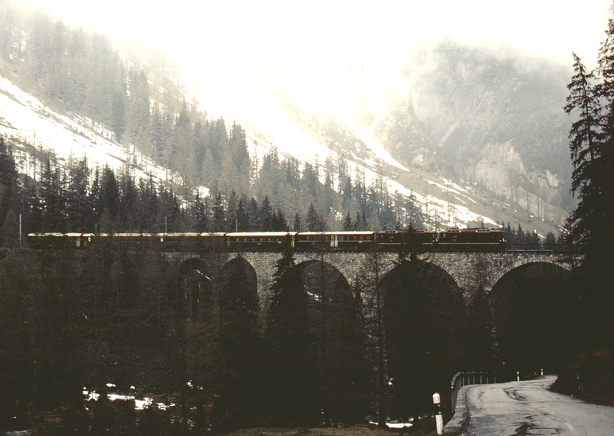 November in Graubünden: Tiefhängende Wolken, keine Sonne, mal Schnee, mal Regen. Auch im Schweizerischen Graubünden herrscht das unangenehme Vorwinterwetter. Allerdings nur wenig Mühe haben die beiden Ge 4/4 III auf der Albulastrecke der Rhätischen Bahn mit ihrem Fünf-Wagen-Schnellzug von Chur nach St. Moritz