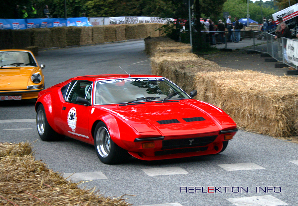 DeTOMASO PANTERA GTS / GT4 vom SPORTWAGEN SERVICE HAMBURG in voller Aktion beim 7. Hamburger Stadtpark Revival. Einige Daten: Baujahr 1970 Länge 4255 mm, Breite 1803 mm, Höhe 1099 mm, Radstand 2515 mm Leergewicht 1382 kg V8, 5766 ccm, OHV, 8 x 2 Ventile, Kompression 11:1 350 PS bei 6000 U/min, 491 Nm bei 3500 U/min 0-100 km/h 5,7 s Höchstgeschwindigkeit mehr als 285 km/h