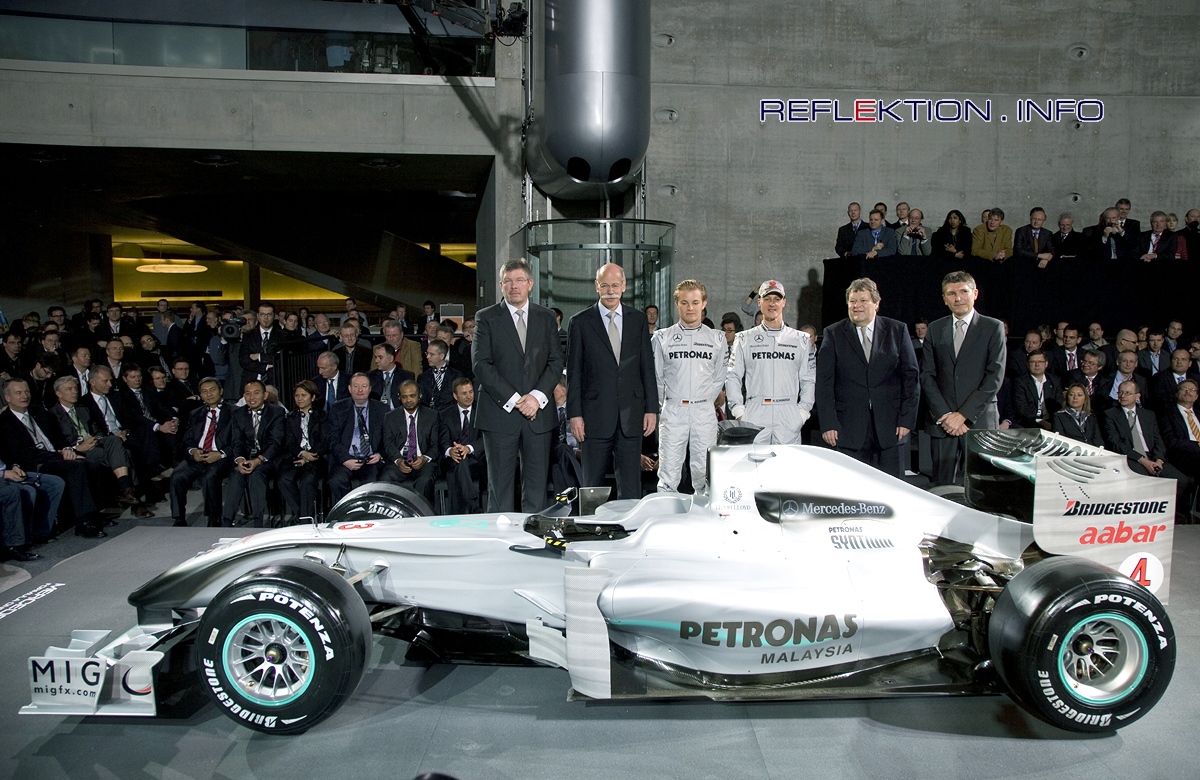 MERCEDES GP PETRONAS Formel 1-Team Präsentation des neuen MERCEDES GP PETRONAS Formel 1-Teams im Mercedes-Benz Museum in Stuttgart vor über 600 Gästen am 25. Janaur 2010 mit (von links): Ross Brawn, Teamchef;Dieter Zetsche, Vorstandsvorsitzender der Daimler AG; Nico Rosberg; Michael Schumacher; Norbert Haug, Mercedes-Benz Motorsportchef; Nick Fry, Vorstandsvorsitzender der Mercedes GP Ltd.