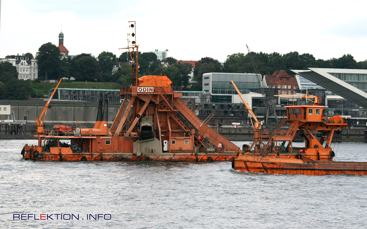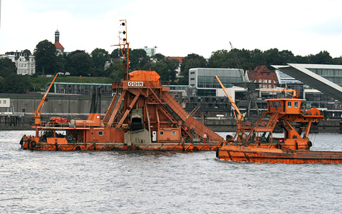 Eimerkettenbagger ODIN 2 Eimerkettenbagger arbeiten im Hamburger Hafen für den Erhalt der Wassertiefen in Fahrwassern und Hafenbecken. Mit 57 Eimern an der Endloskette baggert der 1957 gebaute ODIN pro Stunde rund 300 Kubikmeter Sand, Geröll, Schlamm und alles mögliche vom Grund der Elbe nach oben und schüttet es zum Abtransport in die daneben liegenden Schuten.