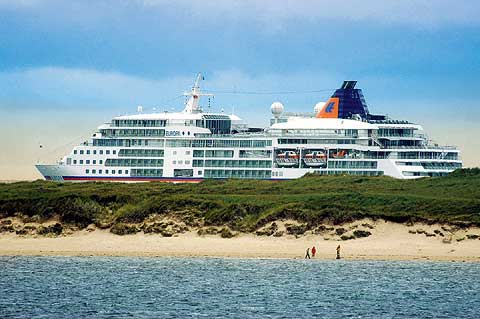 Die MS EUROPA besucht die Insel Sylt und liegt auf Reede vor Rantum. Das Flaggschiff der Reederei HAPAG-LLOYD, setzt international Maßstäbe: Vom Berlitz Cruise Guide 2007 wurde sie bereits zum siebten Mal in Folge als einziges Kreuzfahrtschiff weltweit mit dem begehrten Prädikat 5-Sterne-plus ausgezeichnet. Nie zuvor hat es so viel Raum pro Gast und so viel Privatsphäre zum Wohlfühlen gegeben. Die EUROPA bietet ihren maximal 408 Gästen ausschließlich Suiten mit separatem Wohn- und Schlafbereich. Jede davon verfügt über einen begehbaren Kleiderschrank und nahezu alle über eine private Veranda.