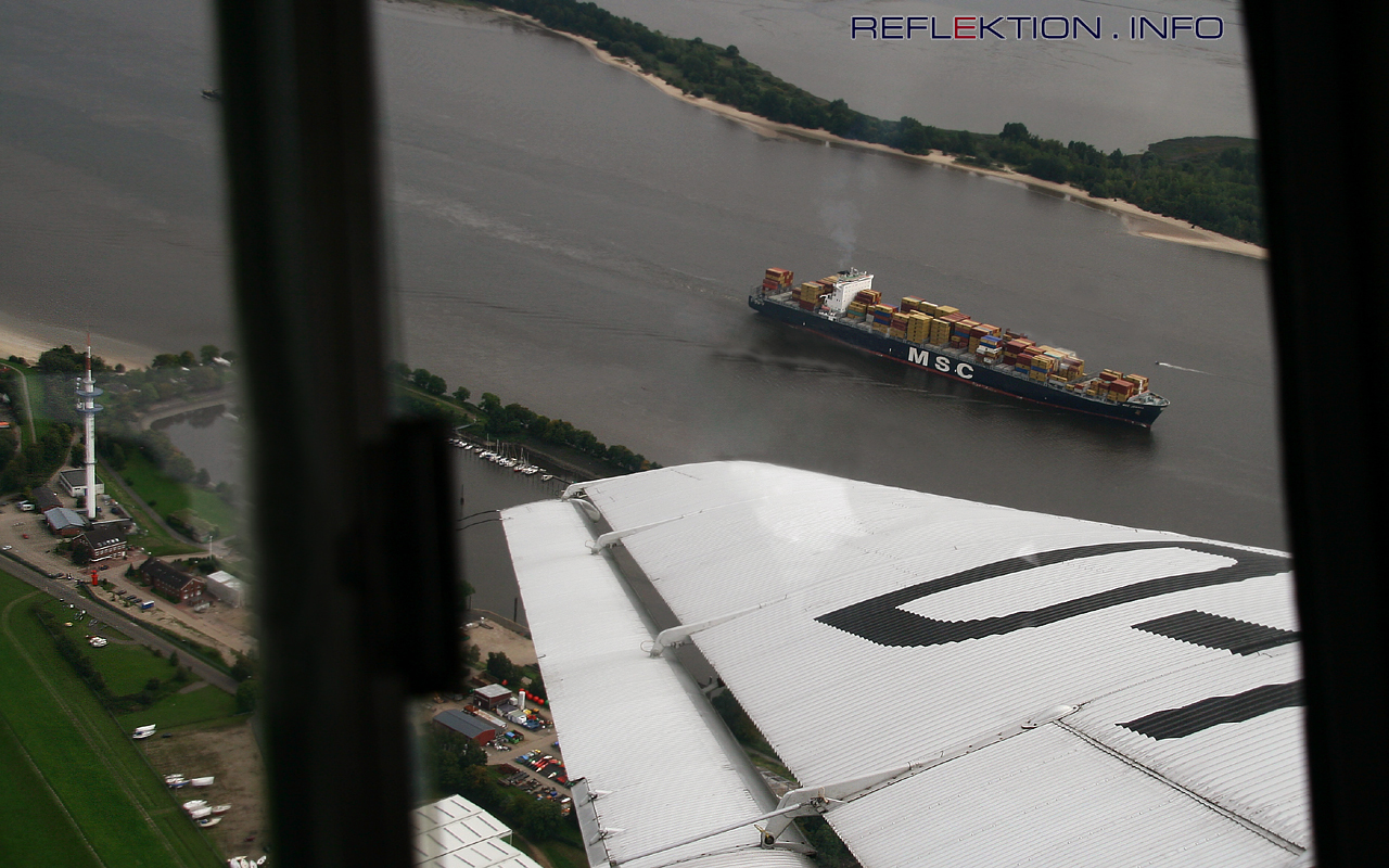 Aus der in 300 Meter Höhe überfliegenden LUFTHANSA Ju-52 D-AQUI wirkt das Schiff nicht besonders groß und die Frage stellt sich,  wie auf diesem Schiff 6732 20-Fuß-Container geladen werden können.