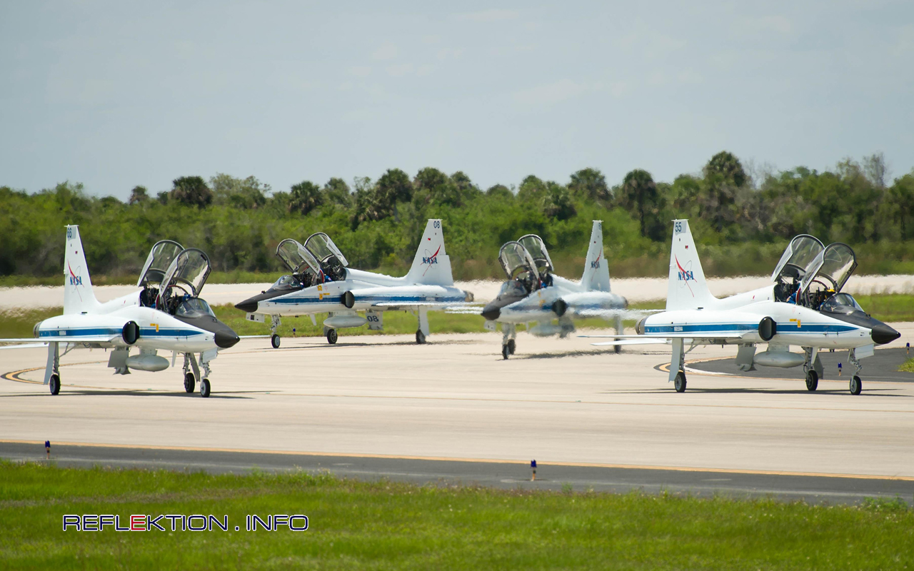 NASA NORTHROP T-38 TALON 08, 55, 61 & 66 Am Freitag, dem 29. April ist mit dem Start der Raumfähre ENDEAVOUR zur Internationalen Raumstation ISS die Space Shuttle-Mission STS-134 geplant. Um 3:47 p.m. Ortszeit (EDT) entsprechend 20:47 Uhr MESZ soll die vierzehntätgige Reise beginnen. Vom NASA Johnson Space Center in Houston kommend traf am 26.4. die ENDEAVOUR-Crew mit ihren Trainingsmaschinen T-38 am NASA Kennedy Space Center Shuttle ein. Die NASA besitzt eine größere Anzahl dieser Maschinen, mit denen das Fliegen mit dem Space Shuttle trainiert wird.