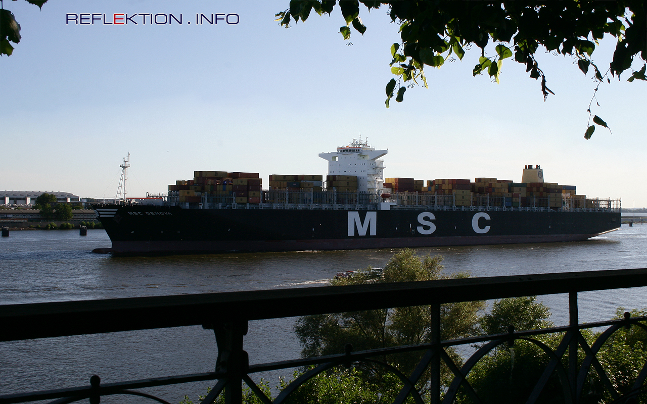 MSC GENOVA Unter den Lindenbäumen in den Gärten der Cafés und Restaurants an der Elbchaussee in Hamburg-Blankenese lassen sich wunderbar die Schiffe auf der Elbe beobachten. Ein nicht zu übersehendes Exemplar ist der einlaufende Schachteldampfer MSC GENOVA. Das 2010 gebaute Schiff ist 365,83 Meter lang, 51,20 Meter breit und liegt bis zu 16 Meter tief im Wasser. Mit einer Leistung des Schwerölmotors von 72.240 Kilowatt werden 24,1 Knoten (45 km/h) erreicht. Bei der Bauart der neuen großen Containerschiffe ist die Brücke deutlich nach vorn versetzt und bietet so viel bessere Sicht. Die Maschine ist jedoch weiter ins Heck gesetzt. Diese Anordnung sorgt für eine bessere Gewichtsverteilung. Die MSC GENOVA kann 166.000 Tonnen tragen, bzw. 14.000 20-Fuß-Container aufnehmen, die zu rund 2 Dritteln unter Deck und zu einem Drittel auf Deck geladen werden. Die MSC GENOVA fährt wie ihre Schwesterschiffe im MSC Silk Service-Umlauf und läuft dabei die Häfen von Antwerpen, Felixstowe, Hamburg, Bremerhaven, Rotterdam, Valencia, Jebel Ali, Ningbo, Shanghai, Xiamen, Hong Kong, Chiwan, Yantian, Singapore an. Die MSC GENOVA ist von der Hamburger Reederei Klaus-Peter Offen für 15 Jahre an MSC (Mediterranean Shipping Company, Genf) verchartert.