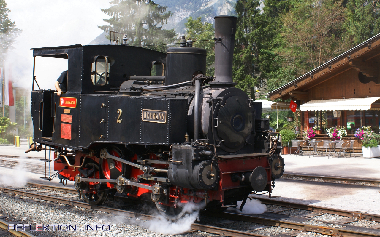 ACHENSEEBAHN LOK 2 HERMANN Die rund 7 km lange Achenseebahn führt von Jenbach hinauf zum Achensee. Für die bis zu 16% steilen Strecken wird eine Zahnstange nach dem System Riggenbach genutzt. Die Bahn überwindet einen Höhenunterschied von 400 Metern. Seit der Eröffnung im Jahre 1899 wird die ACHENSEEBAHN ausschließlich mit Dampfloks betrieben. 4 kleine Maschinen lieferte die Wiener Lokomotivfabrik Floridsdorf im Eröffnungsjahr. Lok 4 wurde um 1950 ausgemustert. An den übrigen 3 Loks sind mittlerweile alle Teile - auch die Rahmen - erneuert worden.