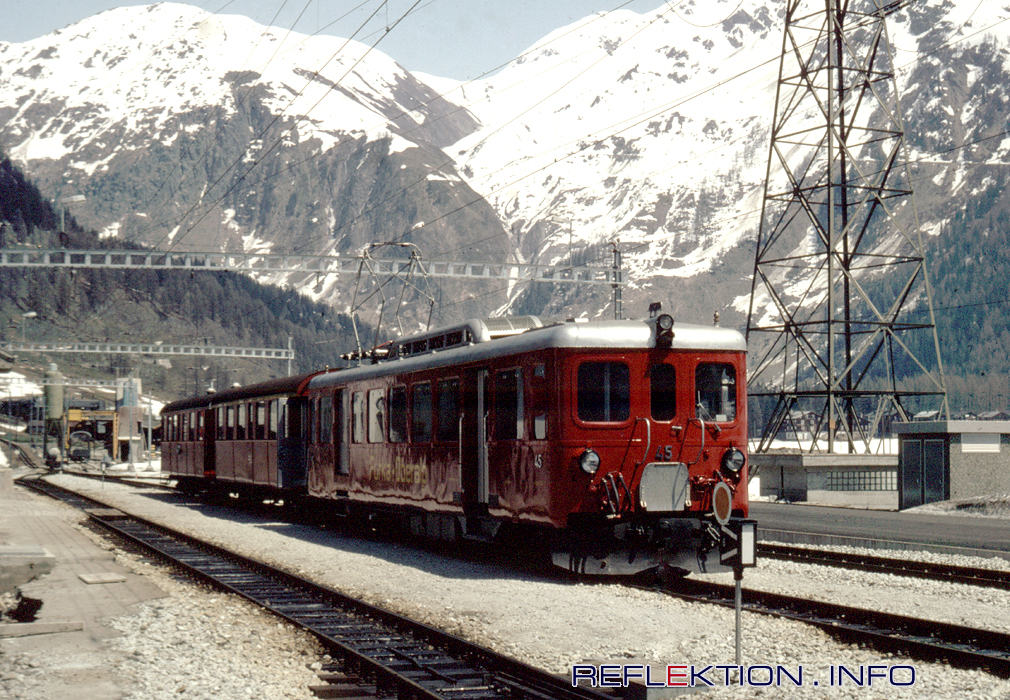 Regionalzug der FURKA-OBERALP BAHN Vor Eröffnung des FURKA-BASISTUNNEL im Jahr 1982 war die FURKA-OBERALP BAHN im Winterhalbjahr in einen östlichen und einen westlichen Streckenabschnitt geteilt. Der Abschnitt über die alte Furkabergstrecke von Oberwald über Gletsch und den Furkascheiteltunnel nach Realp wurde von Mitte September bis Mai geschlossen. Die Schnee- und Lawinenverhältnisse ließen einen durchgehenden Zugbetrieb nicht zu. Schneehöhen von 10 Metern und mehr waren keine Seltenheit. Die Regionalzüge Brig - Oberwald - Brig wurden winters oft aus Triebwagen vom Typ BDeh 2/4 41-45 (Bj. 1941-1943) und 2 bis 4 Altbauvierachsern gebildet. Hier wartet der BDeh 2/4 45 im Bahnhof Oberwald auf das Abfahrtsignal nach Brig. Im Hintergrund links sind die Bauarbeiten am neuen Umfahrtunnel Oberwald zu sehen. Im Tunnelmund steht bereits ein gerade angelieferter Autotransportwagen. Der BDeh 2/4 45 ist hingegen seit gut 6 Jahren nicht mehr in Betrieb.