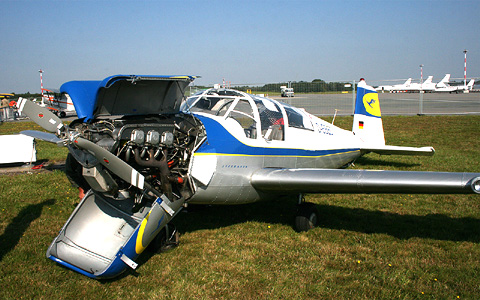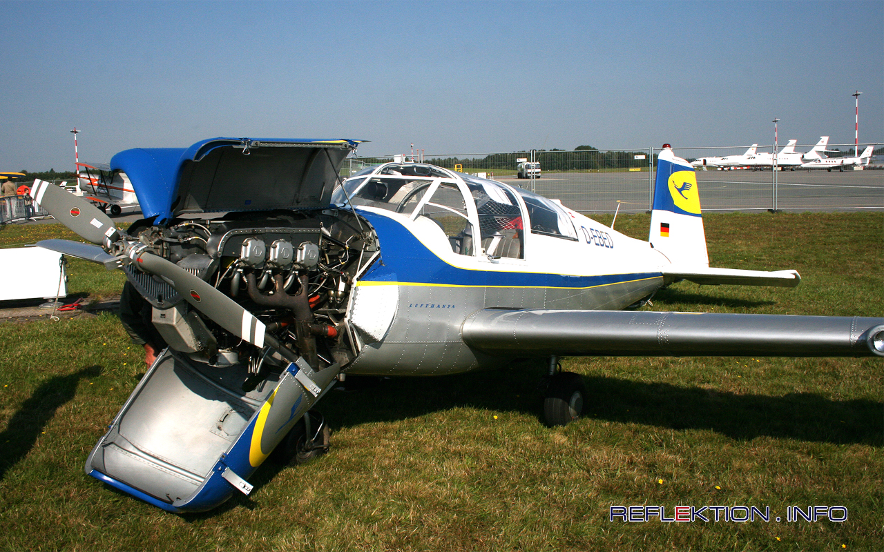 LUFTHANSA TRAINER SAAB SAFIR 91B D-EBED Bereits 1944 begann SAAB mit der Entwicklung des dreisitzigen Tiefdeckers SAFIR mit Bug- und Einziehfahrwerk. Ein 130 PS leistender De Havilland Gipsy Major IC-Motor trieb den zweiblättrigen Propeller an. In die ab 1949 gebaute SAFIR 91B wurde ein 190 PS starker Lycoming O-435A-Sechszylinder-Boxermotor eingesetzt. Neben der erforderlichen Änderung des Motorvorbaus erhielt das Modell nun einen 3-Blatt-Propeller und eine neue Cockpitgestaltung. Neben diversen Luftstreitkräften wurde die als Schulflugzeug genutzte 91B auch bei AIR FRANCE (5 Stück), SABENA (8 Stück) und LUFTHANSA (2 Stück) zur Ausbildung eingesetzt. Die LUFTHANSA restaurierte nach der Ausmusterung die SAFIR 91B D-EBED und zeigt diese Maschine auf vielen Luftfahrtschauen.