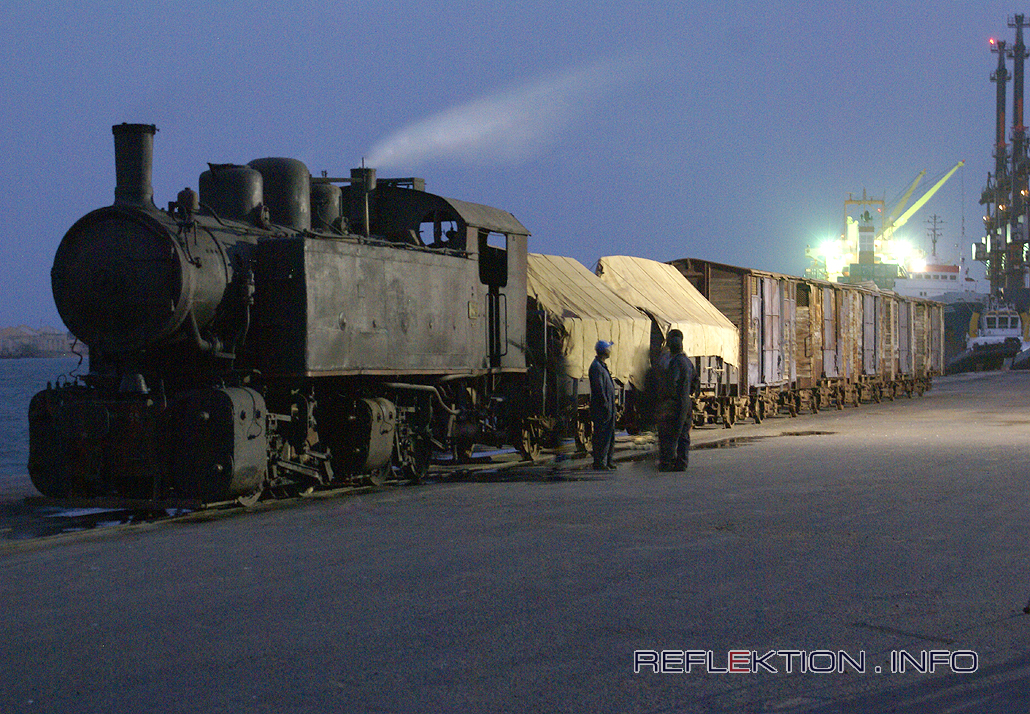 Malletdampflok 442-55 in Massawa Als Eritrea noch italienische Kolonie war, ist von der Hafenstadt Massawa am Roten Meer zur heutigen Hauptstadt Eritreas, Asmara, eine Eisenbahn mit einer Spurweite von 950 mm gebaut worden. Nach Abzug der Italiener war Eritrea von Äthiopien besetzt. Der Unabhängigskeitskrieg dauerte über 30 Jahre, zerstörte das Land nahezu vollständig und endete 1993. Seitdem wird die über 100 km lange Strecke langsam wieder aufgebaut. Erstmals in diesem Jahr wurden für touristische Zwecke Güter- und Personenzüge arrangiert. Am Quai im Hafen von Massawa steht hier die 1938 in Italien gebaute Mallet der Reihe 442 Nr. 55 mit einem Zug aus 2 offenen und 5 gedeckten Güterwagen. Im Hintergrund hat das 160 Merter lange Containerschiff Kotu Harum aus Singapur festgemacht.