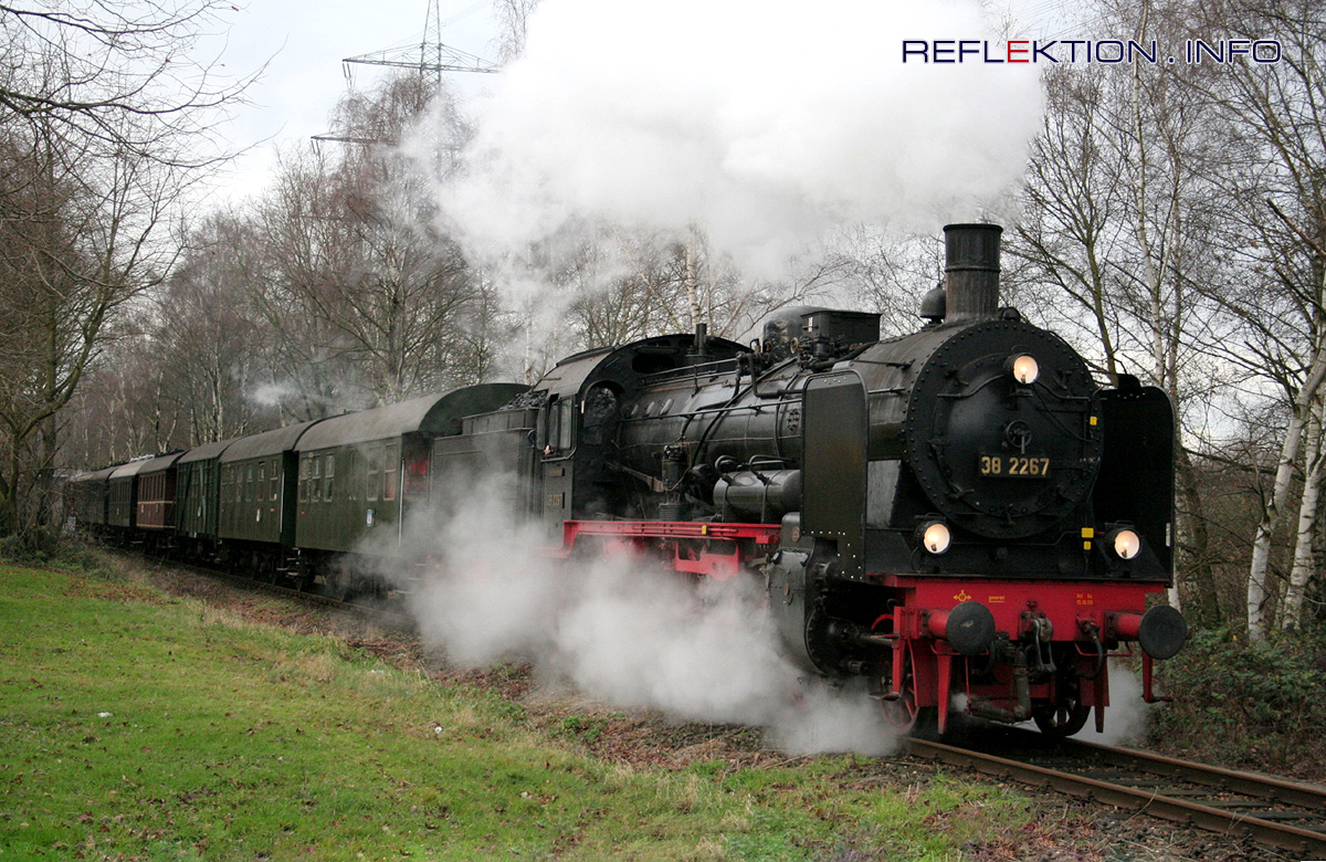 BR 38 2267 Auf der Suche nach einer geeigneten Lokomotive für den Museumszug stießen die Mitarbeiter des Eisenbahnmuseums Bochum-Dahlhausen auf die Preußische P8, 38 2267. Im Jahre 1991 wurde sie vom Denkmalsockel in Wiednitz geholt und nach Meiningen in Thüringen gebracht. Im heute letzten Dampflok-Ausbesserungswerk der Deutschen Bahn AG wurde sie bis April 1992 hauptuntersucht. Fehlende Teile wurden ersetzt und die Lok betriebsfähig hergerichtet. Im Herbst 1992 traf sie dann in Bochum-Dahlhausen ein und zog fortan regelmäßig den Museumszug im Ruhrtal. Im Laufe der Zeit wurde die Maschine schrittweise in den Zustand der Dreißiger Jahre zurückversetzt. Mit der Dampflok 38 2267 und den vorhandenen Museumswagen steht dem Eisenbahnmuseum Bochum-Dahlhausen ein typischer Personenzug der Dreißiger Jahre zur Verfügung. Die Lok wurde 1918 unter der Fabriknummer 15695 von Henschel gebaut. Sie wurde als „2553 Erfurt" in Dienst gestellt und im Erfurter Raum im Personenzugverkehr eingesetzt. Ab 1925 hieß die P8 2553 Erfurt dann BR 38 2267. Während des 2. Weltkriegs wurde sie 1941 in den besetzten Osten versetzt und kehrte 1944/1945 nach Erfurt zurück, wo sie wieder ihre angestammten Dienste übernahm. Bis zur Ausmusterung am Anfang der Siebziger Jahre stand sie zuverlässig im Betrieb Jedoch blieb ihr das Schicksal des Schneidbrenners erspart.Als Denkmal stand sie rund 20 Jahre lang in Wiednitz/Oberlausitz.