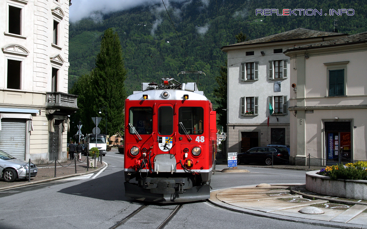 Am südlichen Endpunkt, im italienischen Tirano, überquert die BERNINABAHN mit dem Triebwagen ABe 4/4 48 an der Spitze die italienische Staatsstraße 38 (Comer See - Bormio) zur Rückfahrt nach St. Moritz.