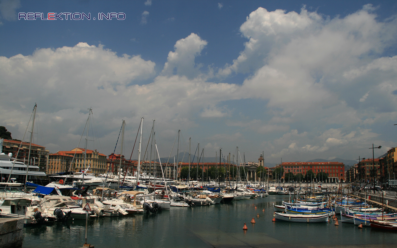 BASSIN LYMPIA - Hafen von NIZZA Der Hafen von Nizza, vielfach auch bekannt als Port Lympia (klares Wasser, altgriechisch), wurde 1749 vom Herzog von Savoyen, Charles- Emmanuel III., gebaut. Erst ab 1793 gehört Nizza als 85. Department Alpes-Maritimes wieder zu Frankreich. Die Hafen-Anlagen wurde in 4 Abschnitte gegliedert; der vordere und der hintere -hier im Bild- dienen heute dem Freizeit- und Sportverkehr. Die beiden mittleren Abschnitte sind der Frachtschiffahrt und den Fährdiensten der Korsika-Fähren vorbehalten. Die zahlreichen Restaurants entlang der Kais sind immer gut besucht. Die hohen und farbig im mediterranen Stil gestrichenen Häuser und die Kirche bilden zusammen mit den Hafenanlagen eine harmonische Einheit. Die Lage auf Google-Maps
