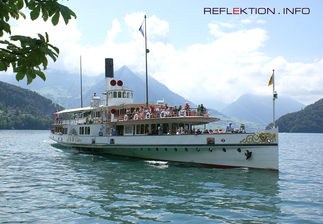Raddampfer URI Vierwaldstättersee-Schiffahrt kurz vor dem Anlegen an der Schiffsländte von Vitznau. Seit 108 Jahren fährt der Raddampfer URI auf dem Vierwaldstätter See von Luzern zu den anderen 33 Anlegestellen des Sees. Die 62 Meter lange und 14 Meter breite URI ist der älteste der 5 noch aktiven Raddampfer auf dem See. Die 650 PS starke Dampfmaschine verleiht der URI eine Höchstgeschwindigkeit von rund 10 Knoten.