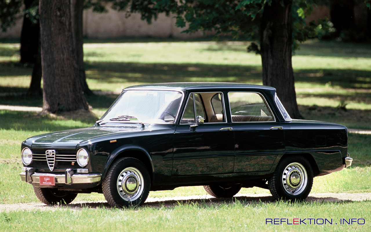 ALFA ROMEO GIULIA BERLINA 1962 - 1978 Die Giulia Limousinenen und Coupé waren eine Kreuzung aus Mittelklasselimousine und Sportwagen und wurde von 1962 - 1978 gebaut. Damals wurden schon beeindruckende 92 PS für den Motor geboten, die leistungsmäßig auf dem Niveau eines Porsche 356 lagen. Die Limousine hatte vier Türen und Platz anfänglich auch vorne eine durchgehende Sitzbank, der damaligen Mode gehorchend. 1963 wurde in Monza eine Sportversion Giulia 1600 TI Super vorgestellt, die mit zwei Weber-Doppelvergasern 113 PS leistete. Das Modell 1600 TI mit 96 PS und dem im Verbrauch leicht reduzierten Motor sollte ab 1967 die Eigenschaften als Langstreckenfahrzeug unterstreichen. Nach diversen Modifikationen im Laufe der Jahre wurde die Giulia-Baureihe 1974 ein letztes Mal modernisiert, gekennzeichnet durch den Namenszusatz Nuova. Die vier Hauptscheinwerfer sind nun gleich groß, den Kühlergrill ziert nur noch eine horizontale Chromleiste. Die Kofferraumhaube verlor die seit 1962 charakteristische Sicke, das „Knochenheck”. In Arese rollten in 16 Jahren rund 300.000 Stück Giulia 1300 vom Band und rund 260 000 Exemplare mit dem 1,6-Liter-Motor.