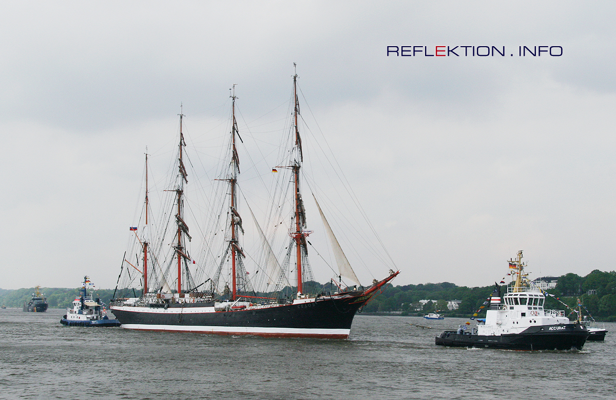Viermastbark SEDOV Die russische Viermastbark SEDOV fährt auf der Elbe bei Hamburg-Teufelsbrück unterstützt von 2 Assistenzschleppern zum 820. Hafengeburtstag in den Hamburger Hafen ein. Für die Bremer Reederei F. A. Vinnen wurde 1921 auf der Kieler Germaniawerft die stählerne Bark vom Stapel gelassen und als MAGDALENE VINNEN II getauft. 15 Jahre lang fuhr das Schiff Weizen aus Australien und Salpeter aus Chile nach Deutschland. Bei jeder Chilefahrt wurde auch Kap Hoorn umrundet. 1936 wurde die MAGDALENE VINNEN II an den Norddeutschen Lloyd verkauft und umgetauft in KOMMODORE JOHNSON. Nach dem 2. Weltkrieg wurde das Schiff als Reparationsleistung an die Sovjetunion übergeben. Vom Heimathafen Murmansk aus fährt die SEDOV seitdem als Schulschiff für die Ausbildung der Mannschaften der russischen Fischereiflotte. Die SEDOV diente auch als Drehort für den Film “Der Untergang der Pamir”. Die der PAMIR bauähnliche, vorher schneeweiße SEDOV erhielt dafür den schwarz-weißen Anstrich mit rotem Unterwasserschiff, den sie (leider) noch heute trägt.