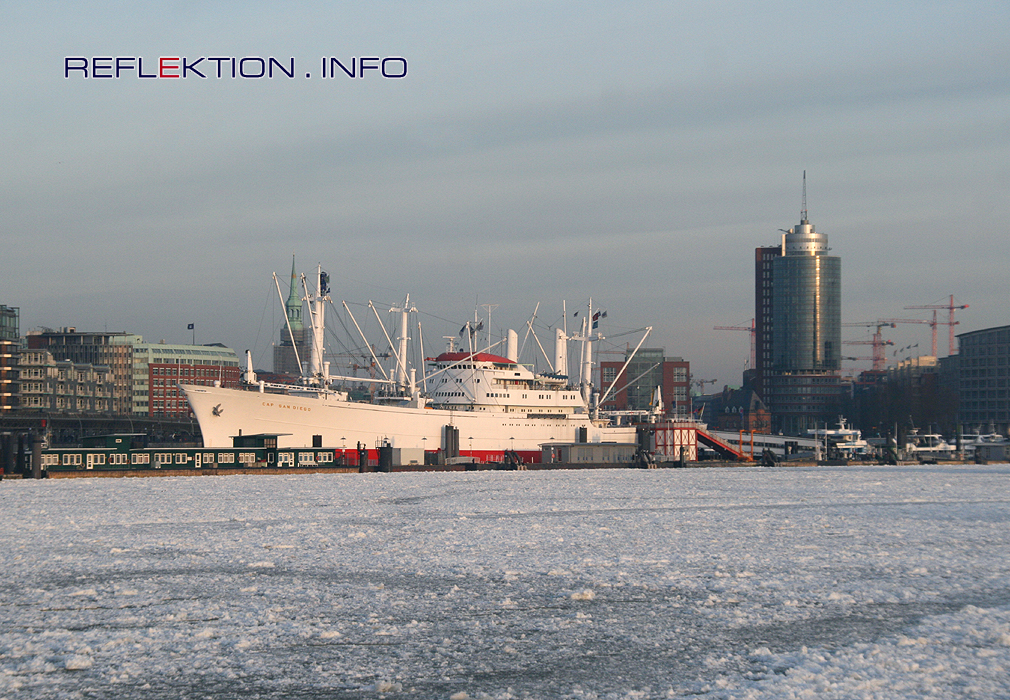 CAP SAN DIEGOWinter im eisbedeckten Hamburger Hafen. Das Museumsschiff CAP SAN DIEGO zieht die Strahlen der Nachmittagssonne auf sich.