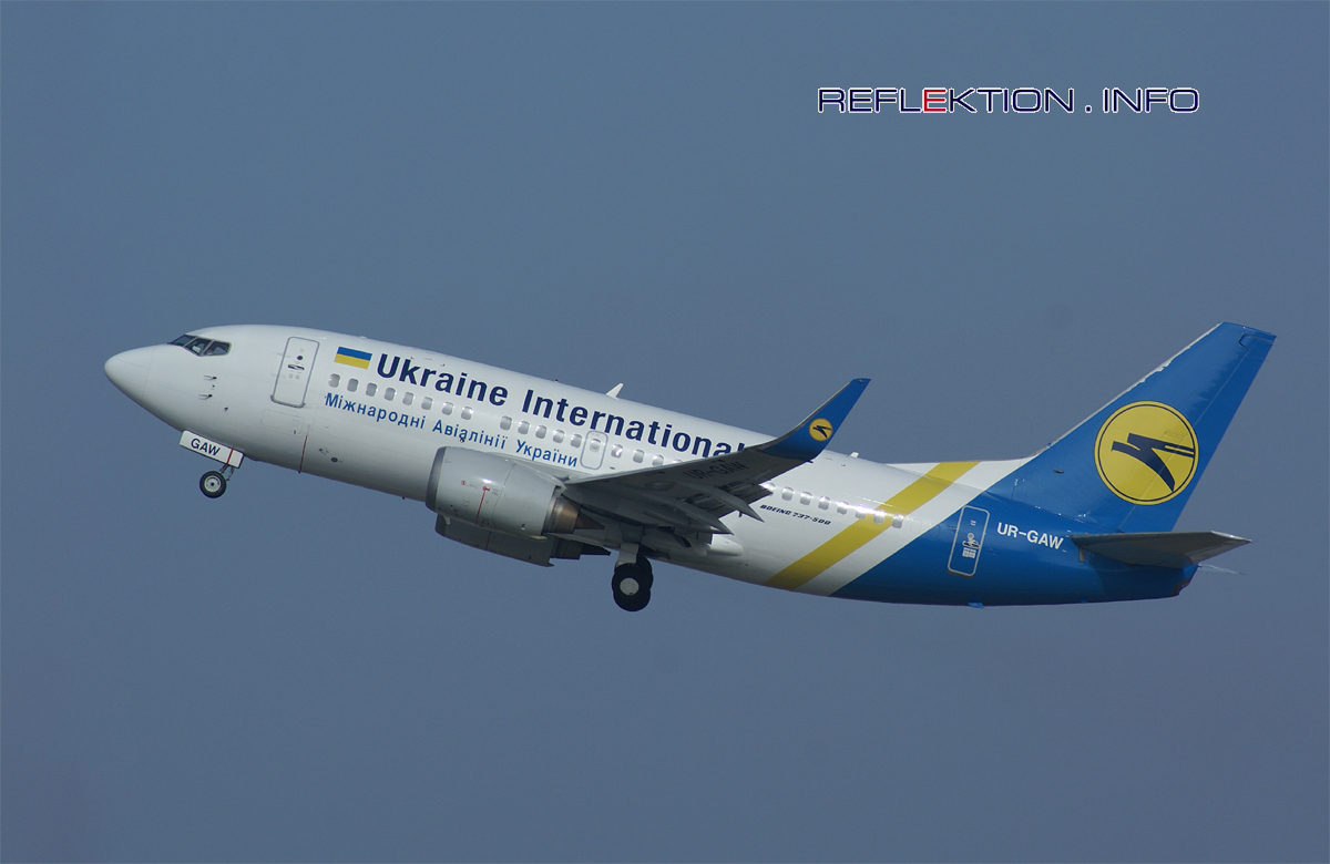 UKRAINE INTERNATIONAL AIRWAYS BOEING B 737-500 UK-GAW AmDienstag Mittag um 12.10 Uhr startet UIA zum Flug von Zürich nach Kiev. Um 15.45 Uhr landet die Maschine in Kiev Borispol. UIA betreibt eine Flotte von 18 Flugzeugen, alles BOEING B737 mit Economy und Business Class, 4 737-300, 6 737-400, 5 x 737-500 und 3 737-800. Das Durchschnittsalter beträgt 14 Jahre.