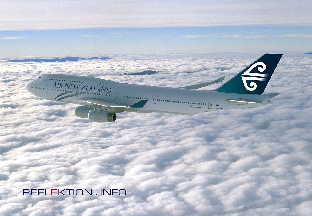 BOEING 747-400 AIR NEW ZEALAND ZK-NBT Stellvertretend für 40 Jahre BOEING 747 und bisher mehr als 1400 gebaute JUMBO fliegt die 747-400 der AIR NEW ZEALAND über Neuseeland.
