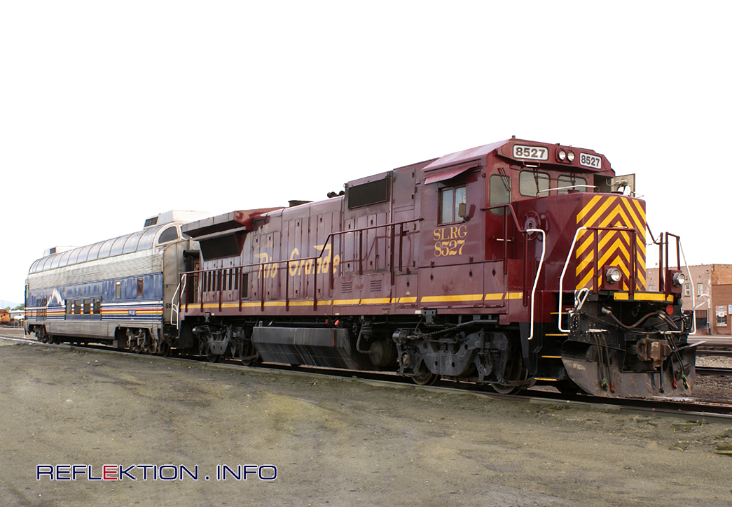 RIO GRANDE SCENIC RAILROAD No.8527 Die normalsuprige Diesellok Nr.8527 der Rio Grande Scenic Railroad wartet im Bahnhof von Alamosa mit ihrem Streamliner-Aussichtswagen auf die Bereitstellung des täglichen Touristenzuges. Die Lok, eine B-39-8E von General-Electric wurde in den späten Achtziger Jahren gebaut und verfügt über 3900 PS Leistung. Die Bahn führt Touristenzüge auf den Strecken von Alamosa nach Monte Vista, nach Chama mit Anschluss an die Cumbres & Toltec Scenic Railroad und über den berühmten Pass nach La Veta sowie verschiedene Themenzüge. Die Züge verkehren mit Dampf- oder Dieseltraktion.