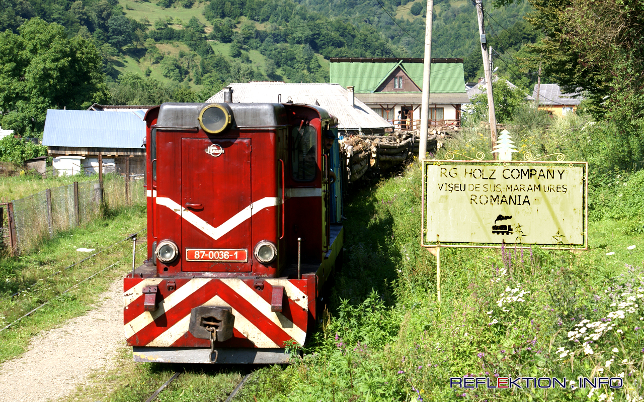 Die Diesellok 87-0036-1 kehrt mit einem voll beladenen Holzzug in den Endbahnhof Viseu de Sus der Wassertalbahn zurück und übergibt die geladenen Baumstämme der Verarbeitungsfirma RG Holz. Die Lok wurde gebraucht erworben und stammt aus der Produktion von FAUR.