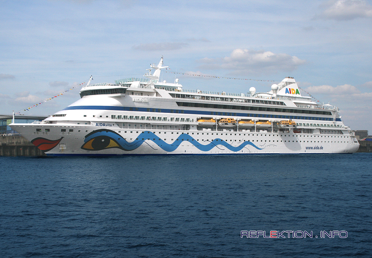 AIDAvita, das zweite Clubschiff der AIDA Cruises Reederei in Rostock, lädt zum Wohlfühlen mit vielfältiger Entspannung, Wellness und Sportmöglichkeiten ein. 3.450 m² Sonnendeck, 1.200 m² Wellnessbereich mit Massage, Thalasso, Kristall-Dampfbad, Finnen- und Kräutersauna gehören zur Ausstattung der AIDAvita. Drei vorzügliche Restaurants stillen in allen Variationen den vielseitigen Appetit der anspruchsvollen Gäste. 5 Bars, sowie Theater und Disco sind bereit, die Nachtschwärmer zu empfangen. Tauchen mit hervorragendem Tauchequipment, Laufparcours für Jogger, Hit-, Relax- und Junior Bikes Tours an Land bieten einzigartige Momente. Ab Oktober 2007 ist der Heimathafen der AIDAvita die niederländische Karibikinsel Aruba. Bis April 2008 wird die AIDAvita ab Oranjestad im Wechsel mit der AIDAaura jeweils Samstags zu zweiwöchigen Kreuzfahrten durch die südliche Karibik aufbrechen. Kategorie: Gehoben - 4 Sterne, Bordsprache: Deutsch, Bordwährung: Euro Baujahr: 2002, Länge: 203 m, Breite: 28 m Tonnage: 42200, Werft: Aker MTW Passagiere / Crew: 1266 / 418