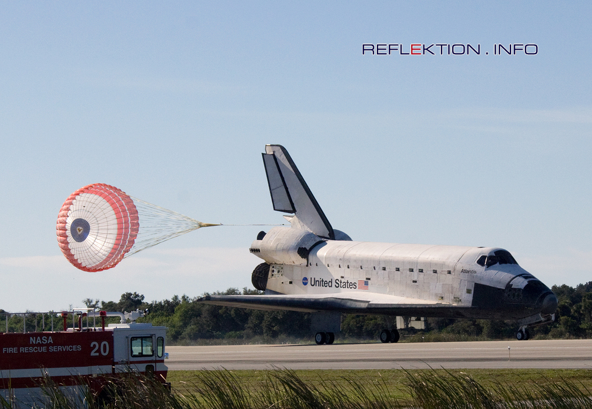 Space Shuttle ATLANTIS Mission STS-129 Für das Space Shuttle ATLANTIS und seine 7 Astronauten endete die elftägige Reise mit der Landung um 9:44 Uhr Ortszeit (15:44 MEZ) auf der Landebahn 33 des Kennedy Space Center in Florida. ATLANTIS umflog die Erde 171 Mal und legte bei dieser Tour zur Internationalen Raumfahrtstation (ISS) seit dem Start am 16. November in 10 Tagen, 19 Stunden, 16 Minuten und 13 Sekunden 4.490.138 Meilen bzw. 8.315.736 km zurück. ATLANTIS' Hauptfahrwerk setzte um 9:44:23 Uhr auf, das Bugfahrwerk 13 Sekunden später. Um 9:45:05 standen alle Räder still. Die Mission 129 umfaßte 3 Arbeitsaufenthalte im Weltraum zur Installation 2 weiterer Module zum Ausbau der ISS. Die Astronautin Nicole Stott verbrachte 87 Tage auf der ISS und kehrte nun mit der ATLANTIS zur Erde zurück. Sie ist das letzte Besatzungsmitglied der ISS, das mit einer Raumfähre der NASA hin und zurück flog, da die Space Shuttle im nächsten Jahr ausgemustert werden. STS-129 war die 129. Mission eines Space Shuttle und die 31. für ATLANTIS. Der Start zur nächsten Mission - STS-130 - ist für den 4. Februar 2010 vorgesehen.