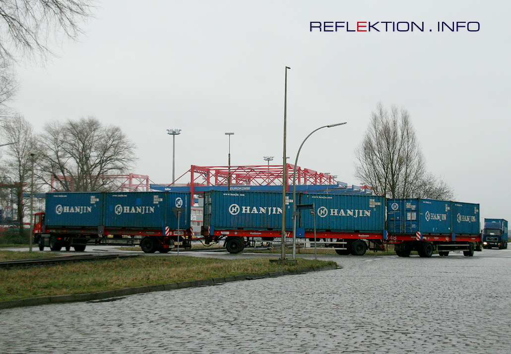 Container-Transport am Containerterminal EUROKAI Zur Verlegung von Containern zwischen den verschiedenen Stellplätzen transportieren diese Spezialtransporter bis zu 6 20-Fuß-Container auf einem Auflieger und 2 Anhängern. Mit einer Sonderzulassung für bestimmte Straßenabschnitte im Hamburger Hafen verkehren die fast 50 Meter langen Transporter mit höchstens 25 km/h.